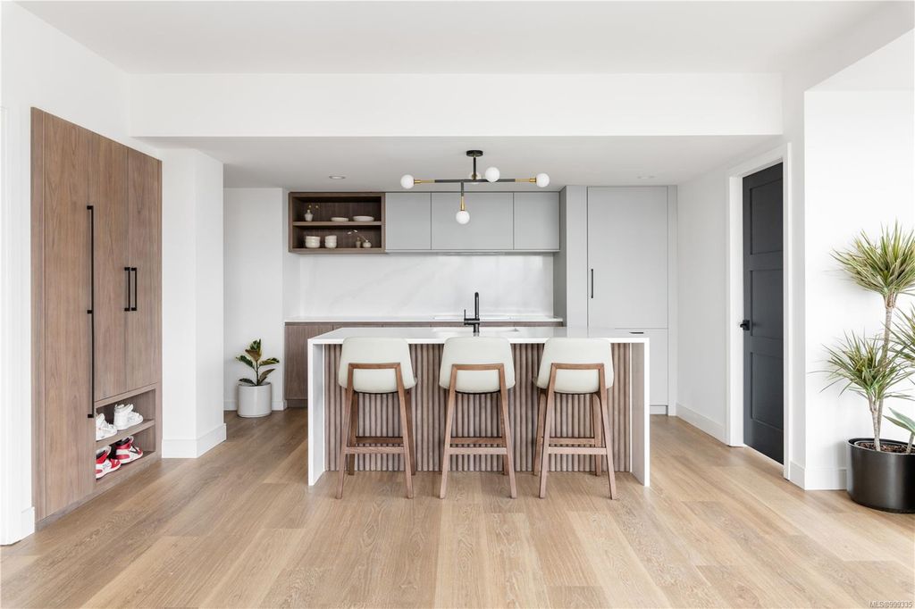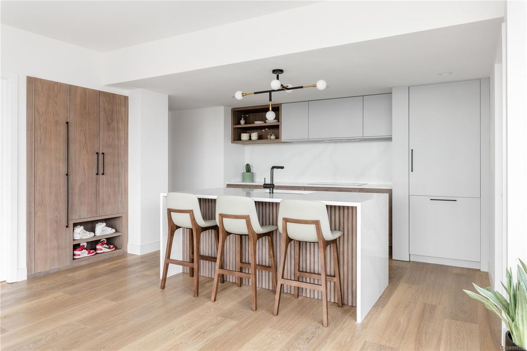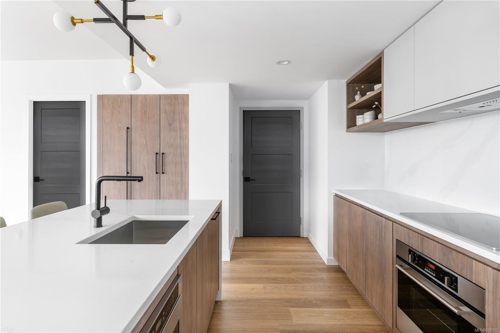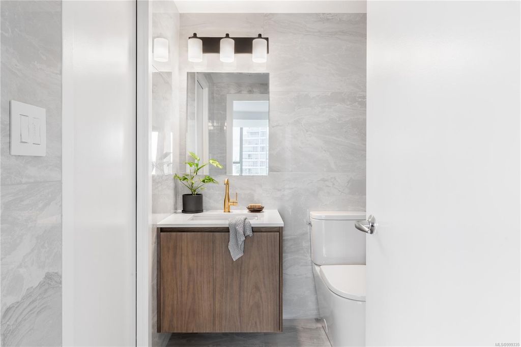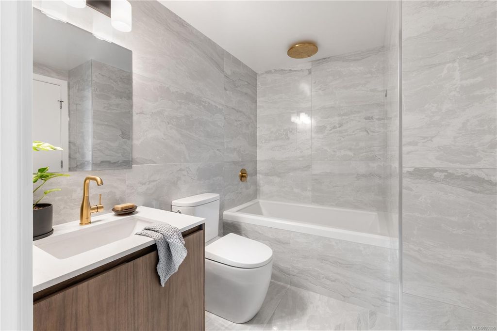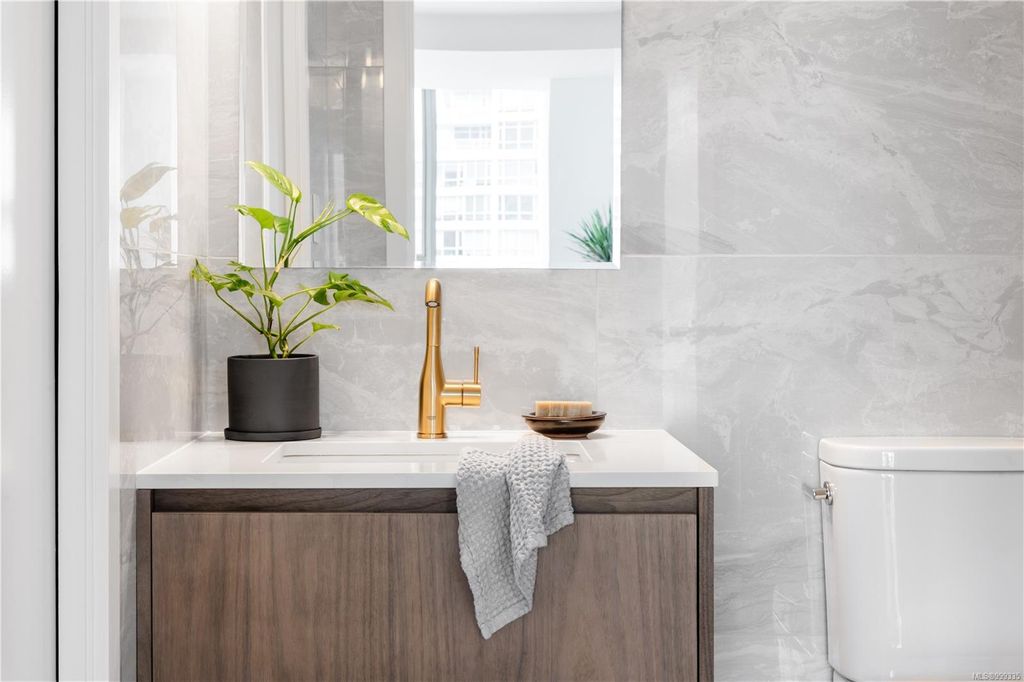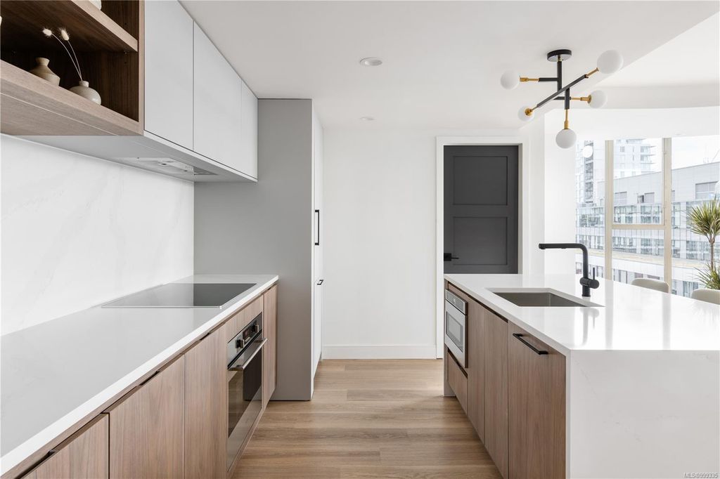 One of the more superior renovated condos in Downtown Victoria, this is Unit 901; a true, top-of-the-line finish, completely remodelled and tech-updated corner unit in the iconic Art Deco Juliet building. The southeast-facing 9th-floor condo boasts luxurious finishes, including Buster+Punch hardware, a Thomas+Birch custom kitchen w/ wood millwork, quartz countertops and backsplash, premium S/S appliances, motorized curtains, and a fully tiled 4-piece bath. A one-of-a-kind rounded wall of floor-to-ceiling glass provides stunning panoramic city views, extending to the Olympic Mountains and the Dallas Rd waterfront. The exceptional layout features two well-separated bedrooms, a custom feature wall with office stand, bar, and in-unit laundry. Building features inc Rooftop w/ 360-degree views and BBQs, unrestricted rentals, and pet friendly. This condo is ideal as a great investment or a perfect home, steps away from shopping, dining, and all Downtown Victoria offers.
