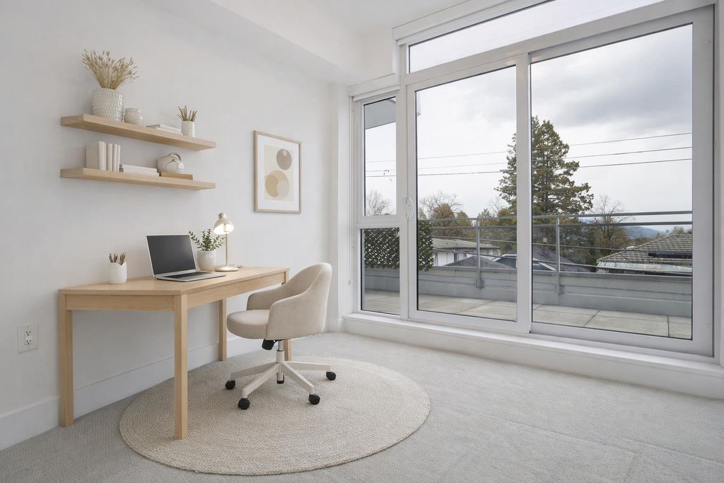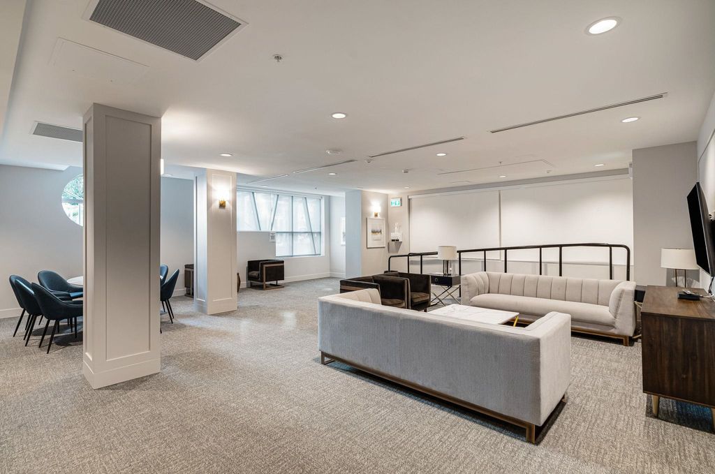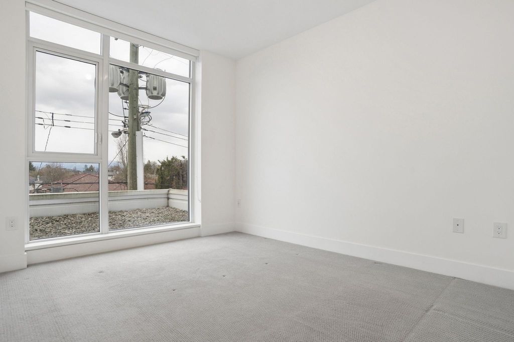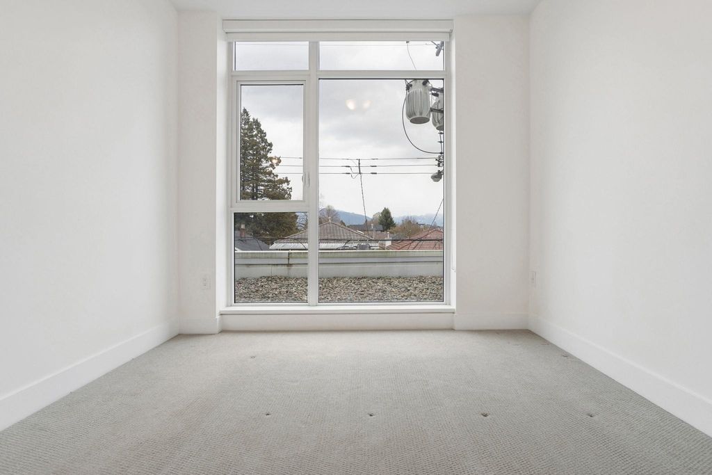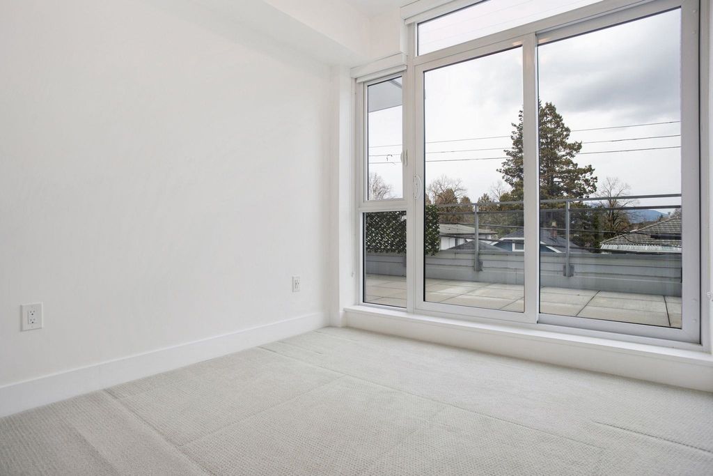 The Windsor. Rare 3 bedroom home in a concrete 6-storey building with only 14 units offering exceptional privacy. This bright corner residence is one of just four homes on the floor and offers nearly 1,000 sqft of efficient interior living space with a spacious open kitchen, dining and living area ideal for entertaining. Enjoy mountain views and a generous 231 sqft balcony—an ideal extension of living space. The modern kitchen features Bosch appliances, sleek cabinetry and ample prep space. Year-round comfort with heating and cooling. Amenities include a landscaped rooftop courtyard with BBQ area, fitness centre and residents’ lounge. Steps to shops, cafés, parks and SkyTrain. Includes 2 parking stalls and remaining new home warranty.