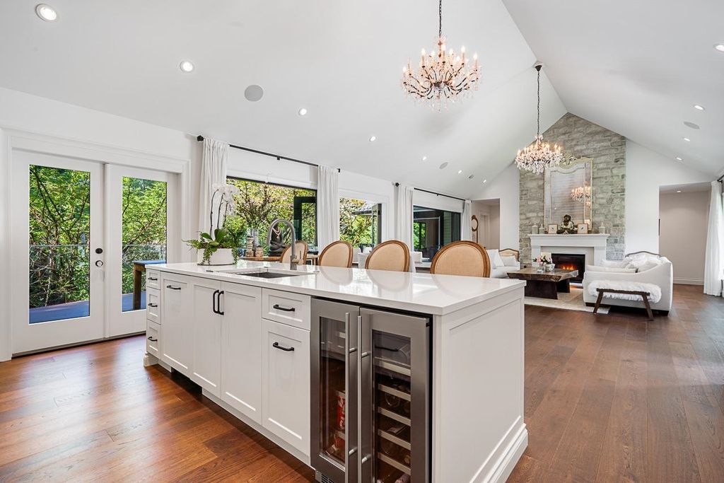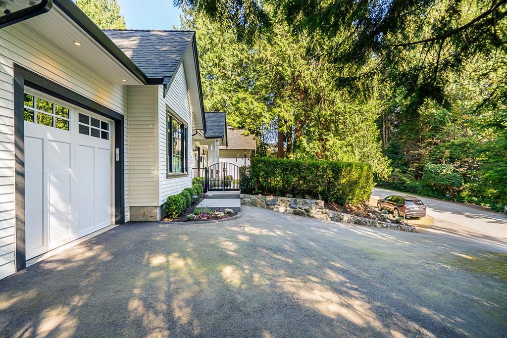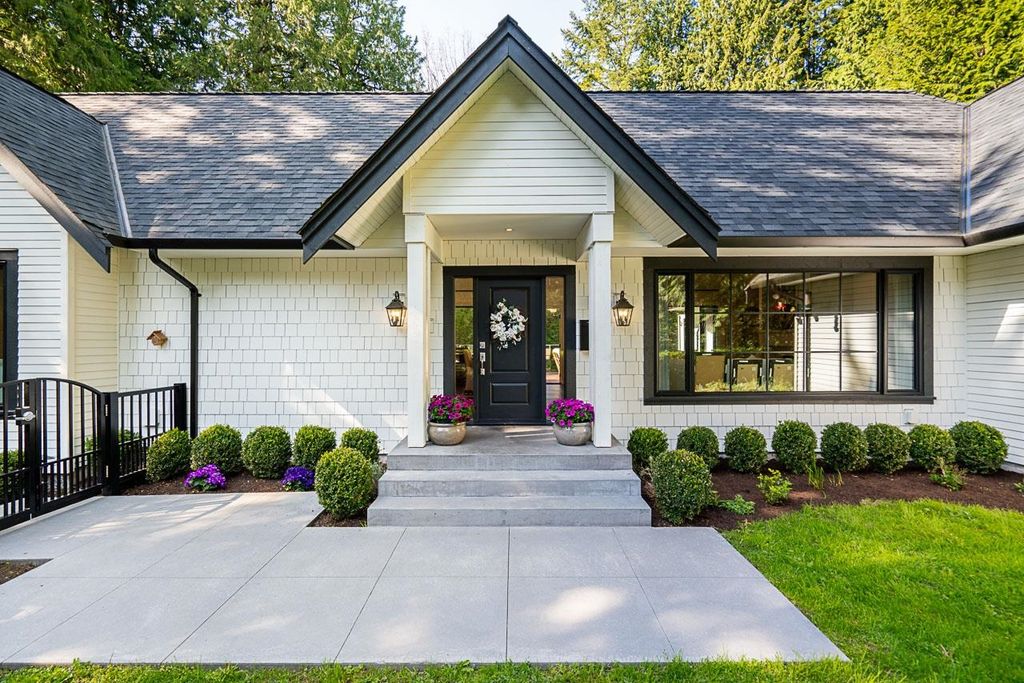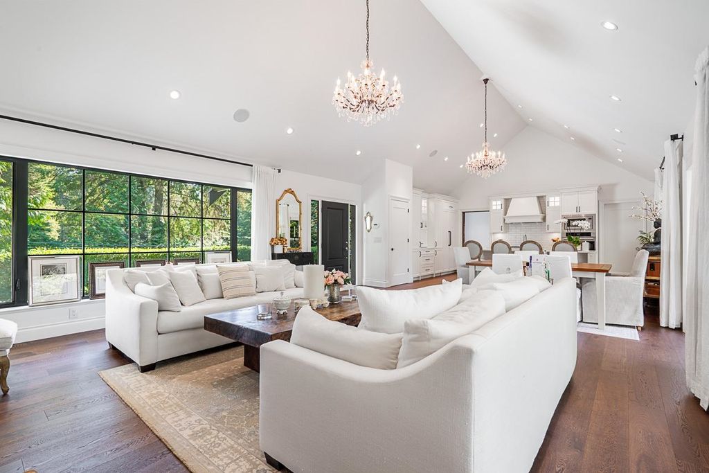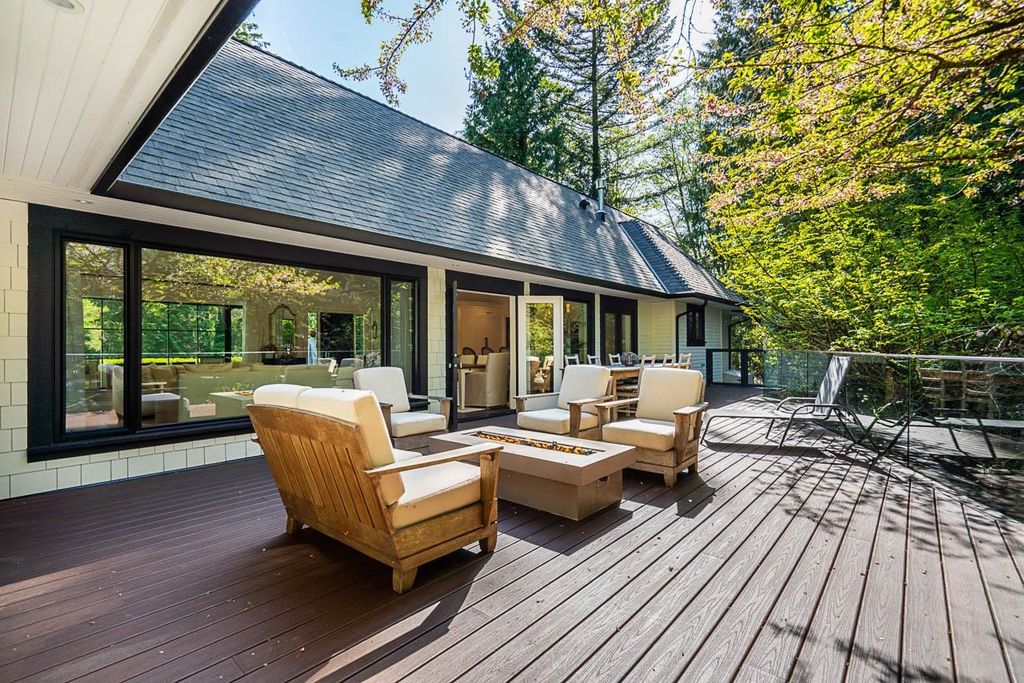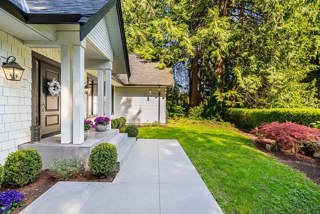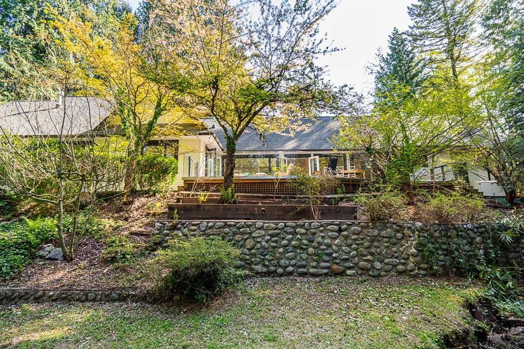 Discover this truly special one-level custom home on a private half-acre lot featuring beautiful, serene gardens. Meticulously rebuilt by Goldwood Homes from the foundation up, it features floor-to-ceiling windows, 15-ft vaulted ceilings, rich hardwood floors, and an open-concept layout with a gourmet kitchen, dining, and living area anchored by a stunning stone fireplace. With 3 bedrooms, 3 baths & family room, and a spacious primary suite which offers a spa-like ensuite and walk-in closet. French doors lead to expansive decks for indoor/outdoor living and entertaining amid lush gardens. Enjoy 3 gas fireplaces, Italian stone, heated bathroom floors, and beautiful custom finishes. Ideally located near schools and minutes from Park Royal.