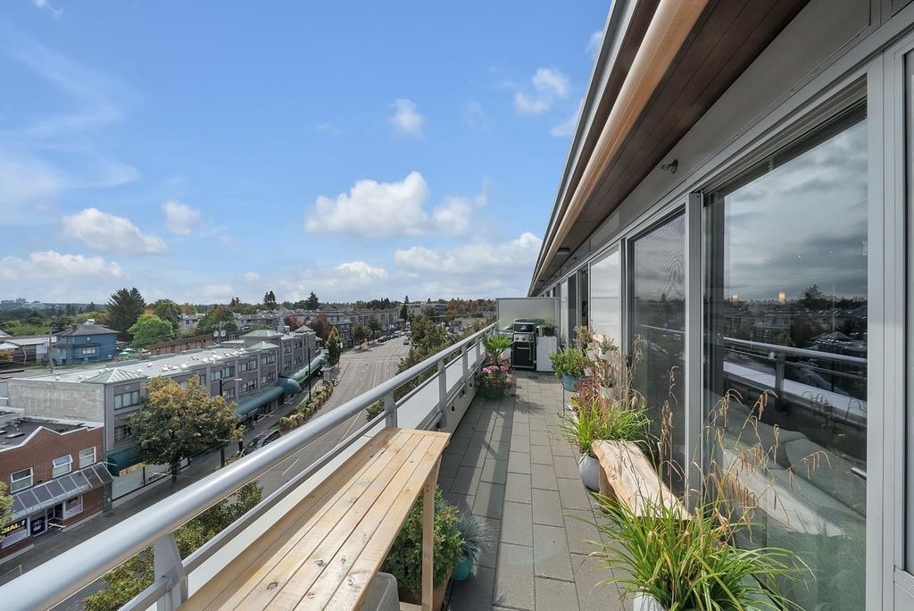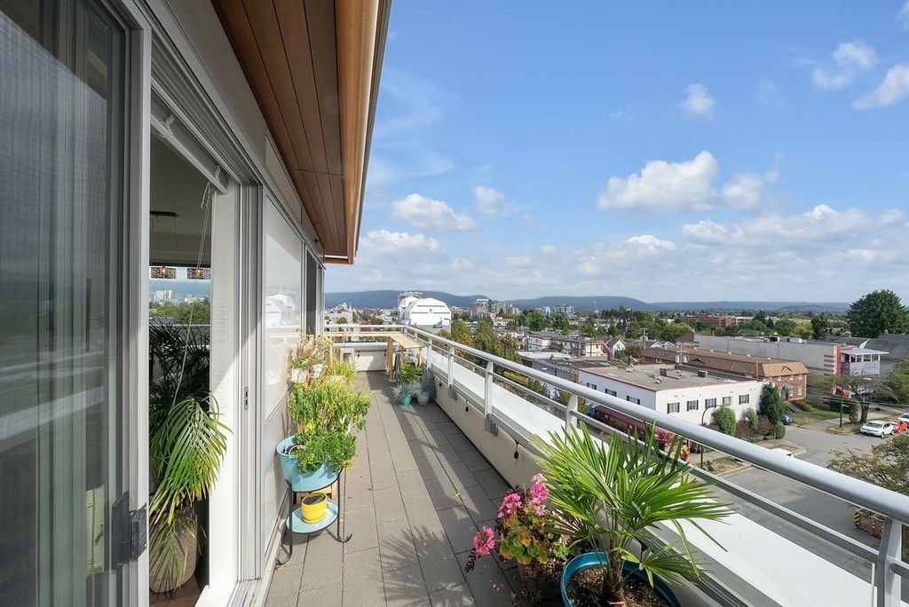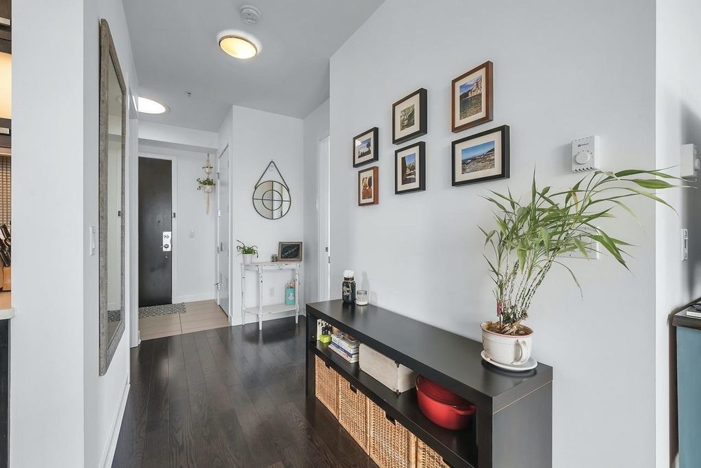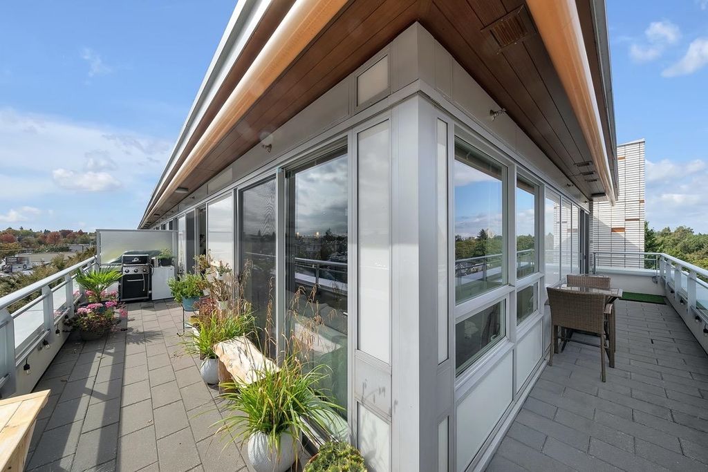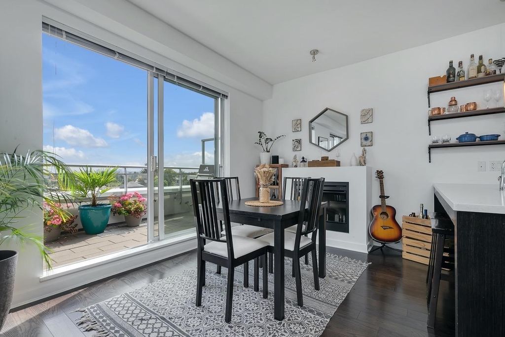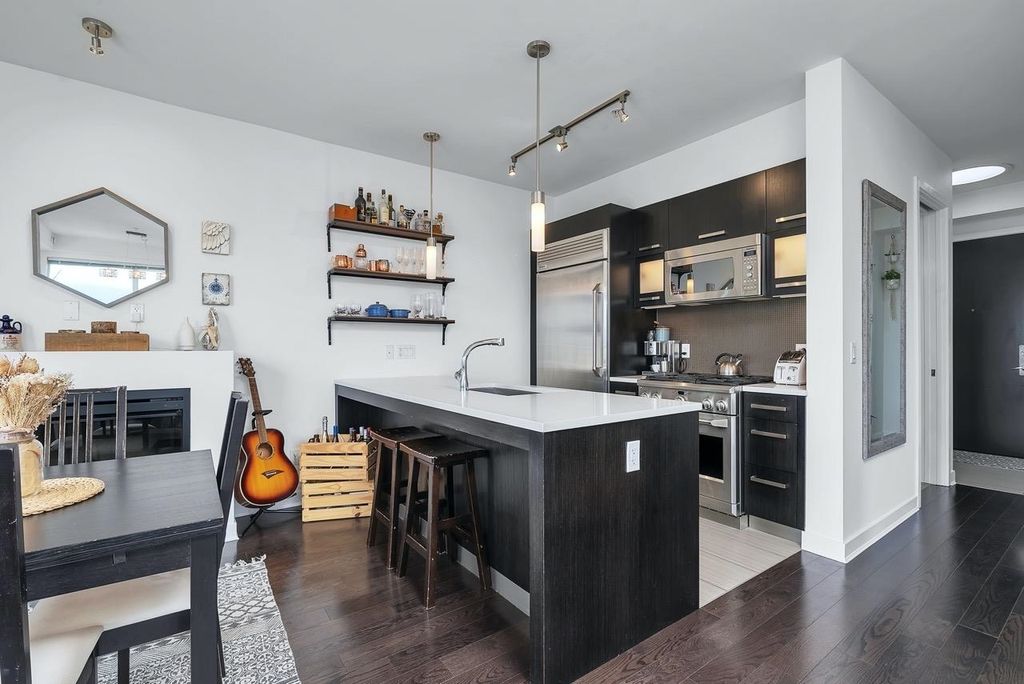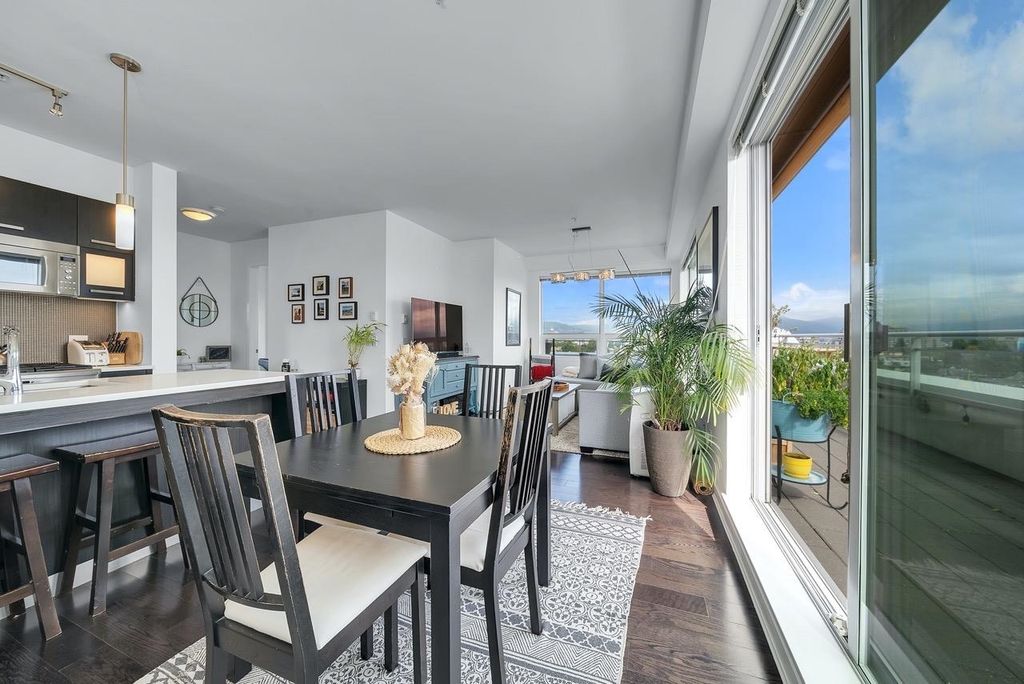 A truly unique one bedroom, two bathroom & flex NE corner penthouse in the heart of Main Street. This bright and open floor plan features engineered hardwood flooring, over-height ceilings & floor to ceiling windows highlighting the panoramic city views from the massive wrap-around private patio. Focussing on every detail, this exceptional home boasts premium finishings with quartz countertops, stainless steel appliances, gas range, sun tunnel skylight in the naturally bright foyer, large walk-in closet, Nuheat flooring in the ensuite with direct patio access from the bedroom. Developer originally planned as a 2 bed unit - potential to build out second bedroom. Bonus - two parking spots, gas bbq hook-up & storage included! Pet friendly building.