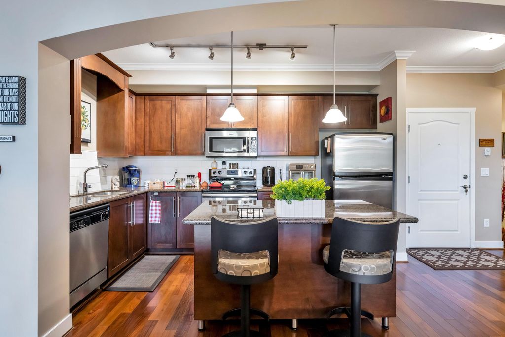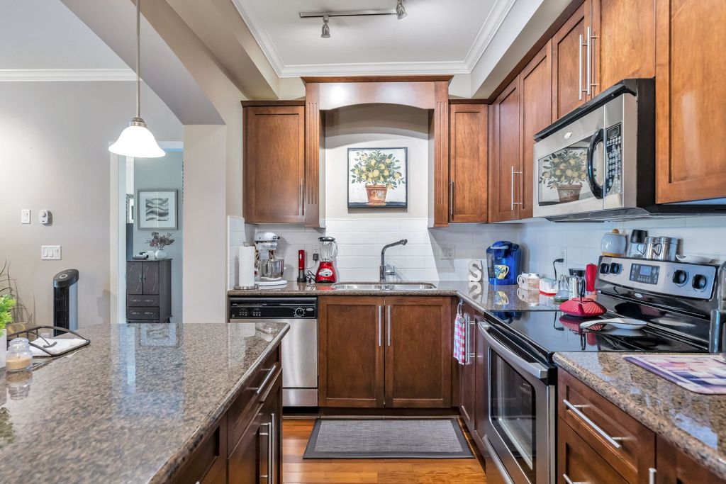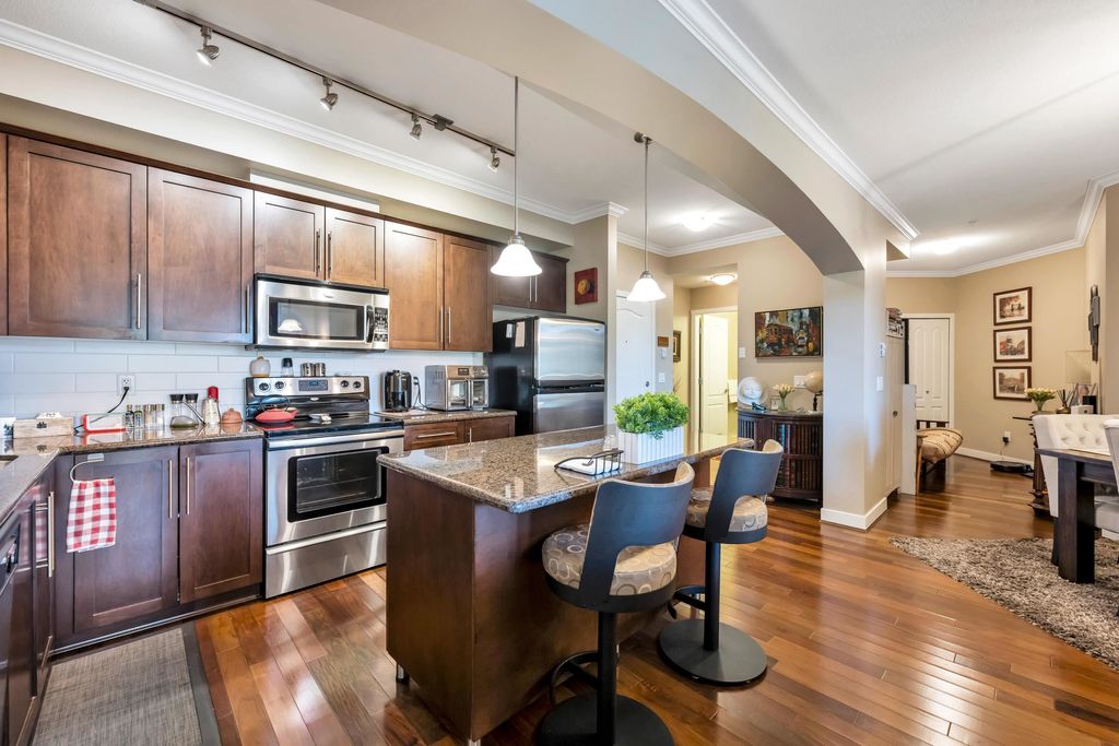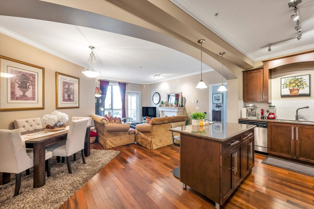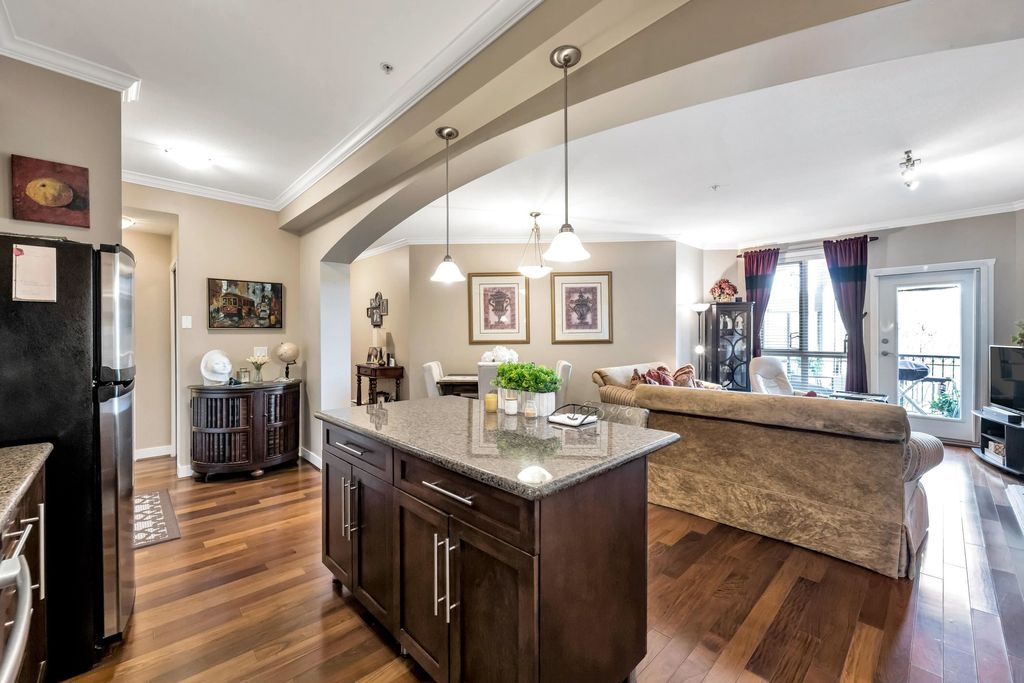 VILLAGIO II ~ Luxury living in the heart of downtown Port Coquitlam! SE facing spacious open-arch concept unit bursting w/ natural light & featuring opulent high-end finishings {brazilian hardwood/crown molding/chef kitchen w/ an expansive granite center dining & entertaining island/ultra wide complex corridors. Nestled between two parks {tennis courts/soccer/fields & access to 25kms of walking/running/biking trails that circle Port Coquitlam along the banks of the Coquitlam/Pitt & Fraser Rivers}. Minutes access {West Coast Express/highways/shops/schools/clinic/dining & coffee shops}. Incredibly well-managed strata {1dog & 1cat welcome/1parking & 1storage locker/gym/amenity & bikeroom}. NEW HW tank.