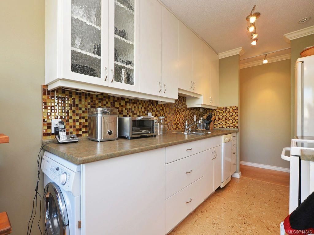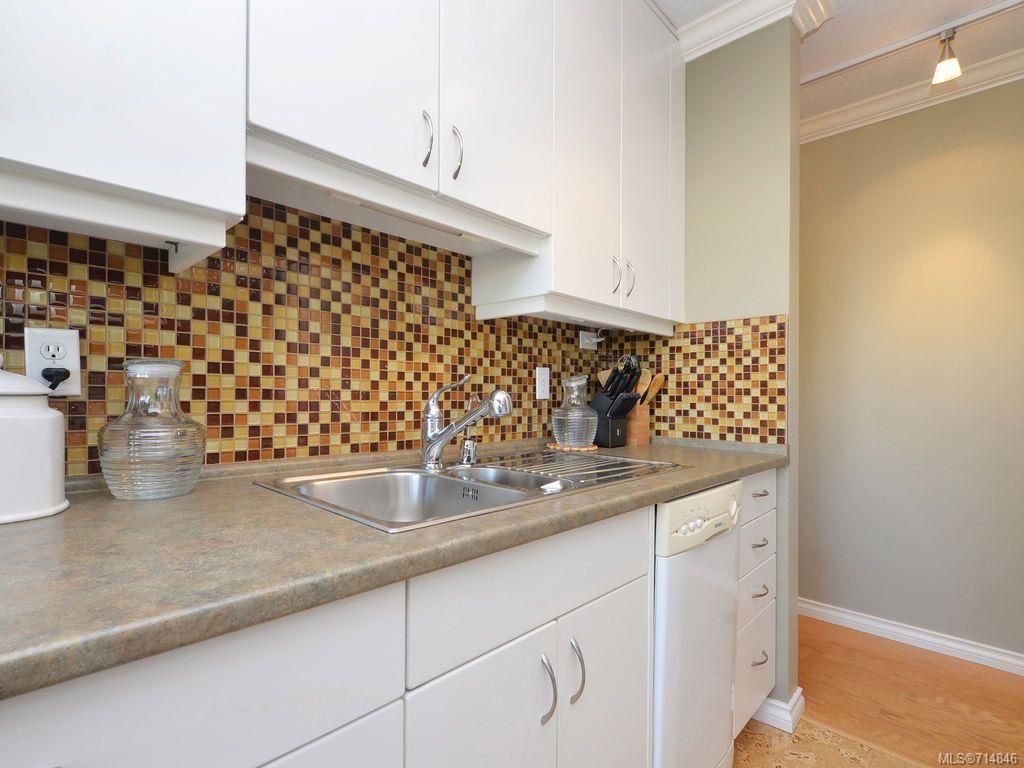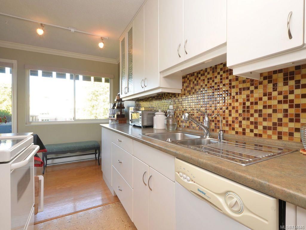 Sunny,spacious 1 bedroom top floor south west corner unit with tree top views and some views of the Olympics mountains. Lots of updates including windows, patio door, kitchen cabinets complimented by glass tile, newer appliances & cork flooring. 2 cats allowed, no dogs. Save auto expenses as easy walk to city core, Cook St. Village, park & ocean. Ideal for 1st time buyer, retiree, student. No rentals allowed, and 19 plus age restriction. Shared laundry in the building. Bonus: assessment includes heat and hot water. Well priced home in a fantastic location.