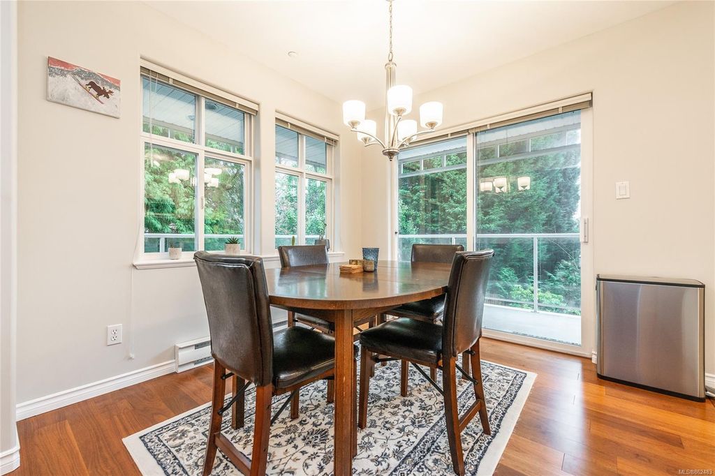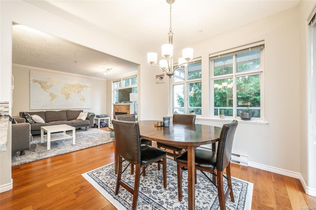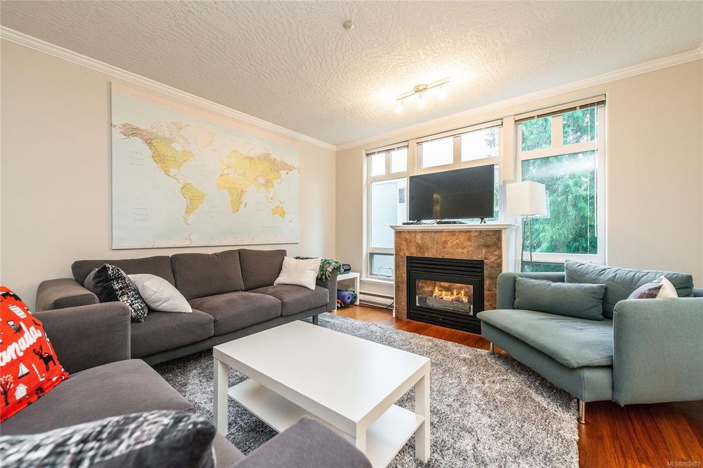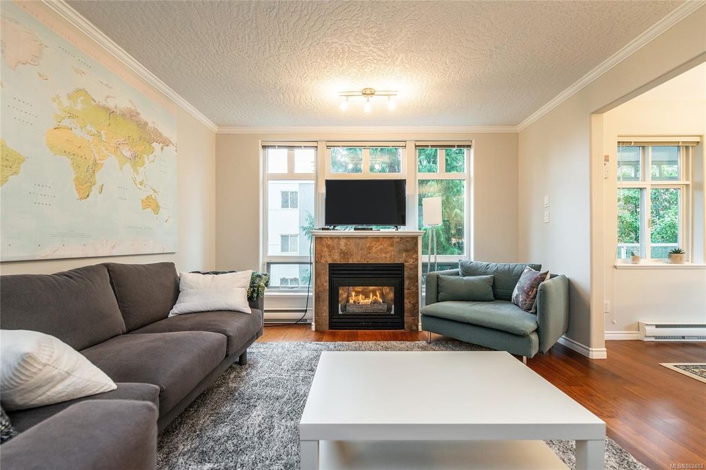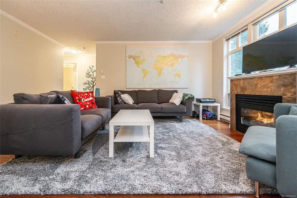 Modern South facing, very bright & open concept, 2 bedroom, 2 full bath, corner condo suite. Nicely finished with a designer's touch throughout. This inviting living space offers an expansive floor plan with over 1000 sqft of living space, with hardwood floors, a cozy GAS fireplace, in-suite side by side full-size laundry, south-facing wrap-around covered patio, open kitchen with stainless steel appliances, granite counters, separate dining, en-suite bathrooms, storage locker, and secure underground parking. This unit is on the sought after “quiet” south side of the building, with large windows and an open concept plan, and complete separation of the bedrooms. The location is perfect; being close to Tuscany Village, and walking distance to UVIC, shopping, and all amenities at University Heights. This home is ready to move in and enjoy. GAS heat included in strata fee!