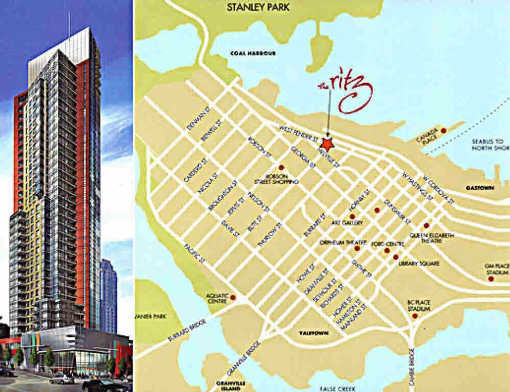 The Ritz - seldom available 3 bedroom 3 bath unit in Coal Harbour area. Northwest facing, 1,340 sq ft, 9' ceiling, air conditioning. Amenities: Indoor swimming pool; Sauna; Fitness centre; Lounge. Non-registered Strata Title. Measurements from plan, to be verified by buyer. Scheduled completion date mid 2007. Presentation Centre @ 1366 W. Pender St, Vancouver. Open daily noon to 6pm.