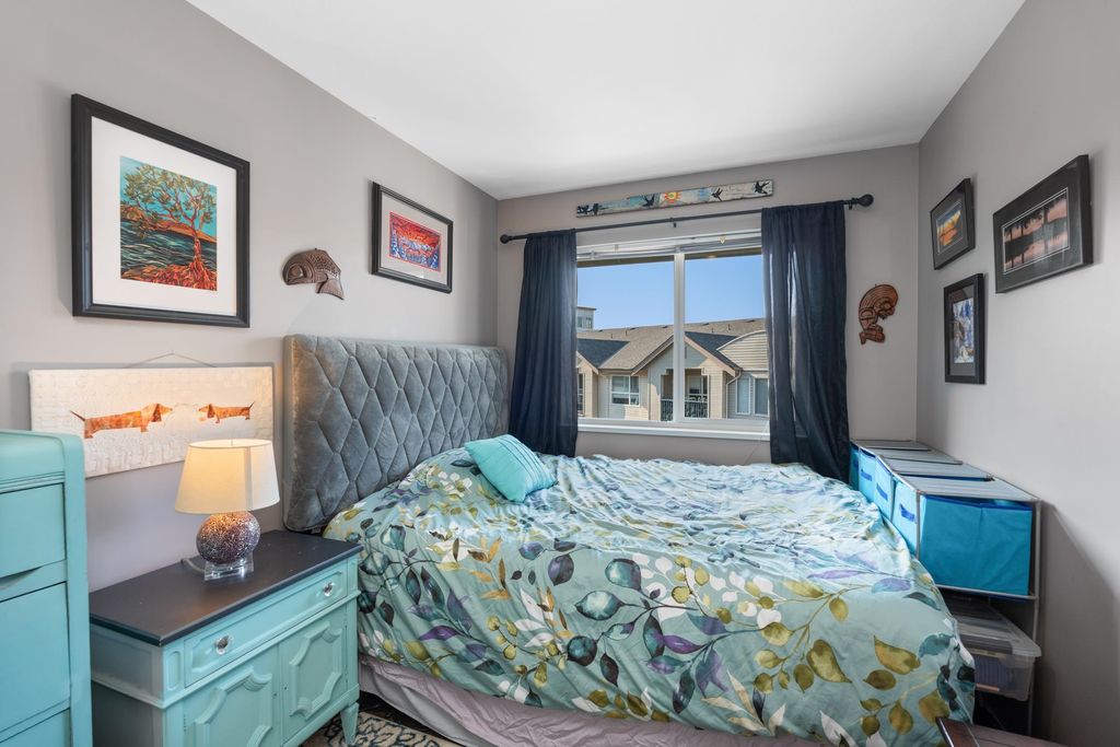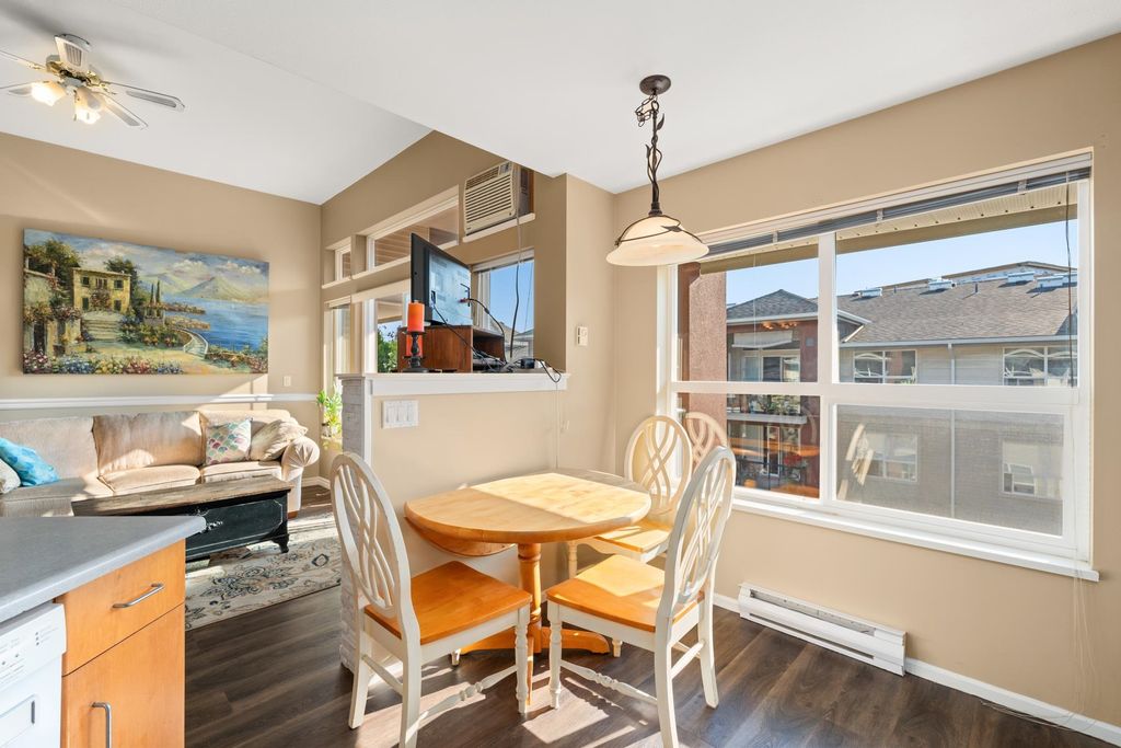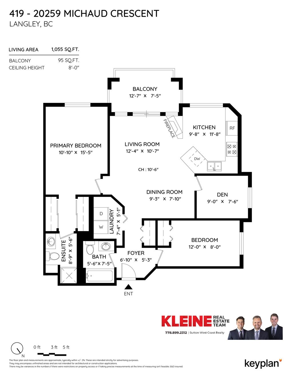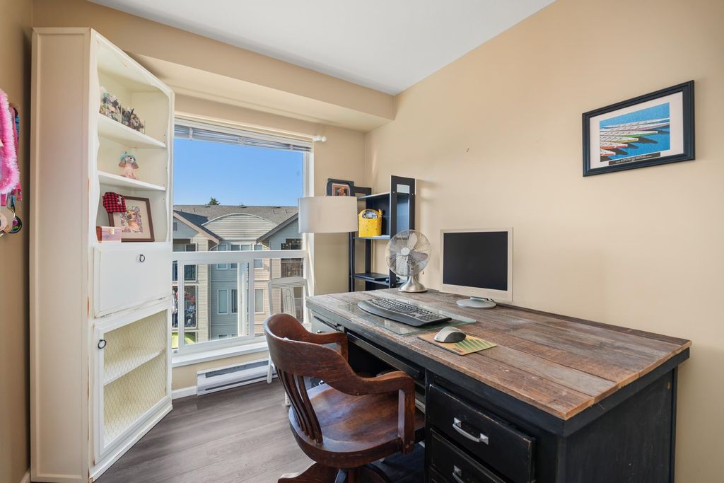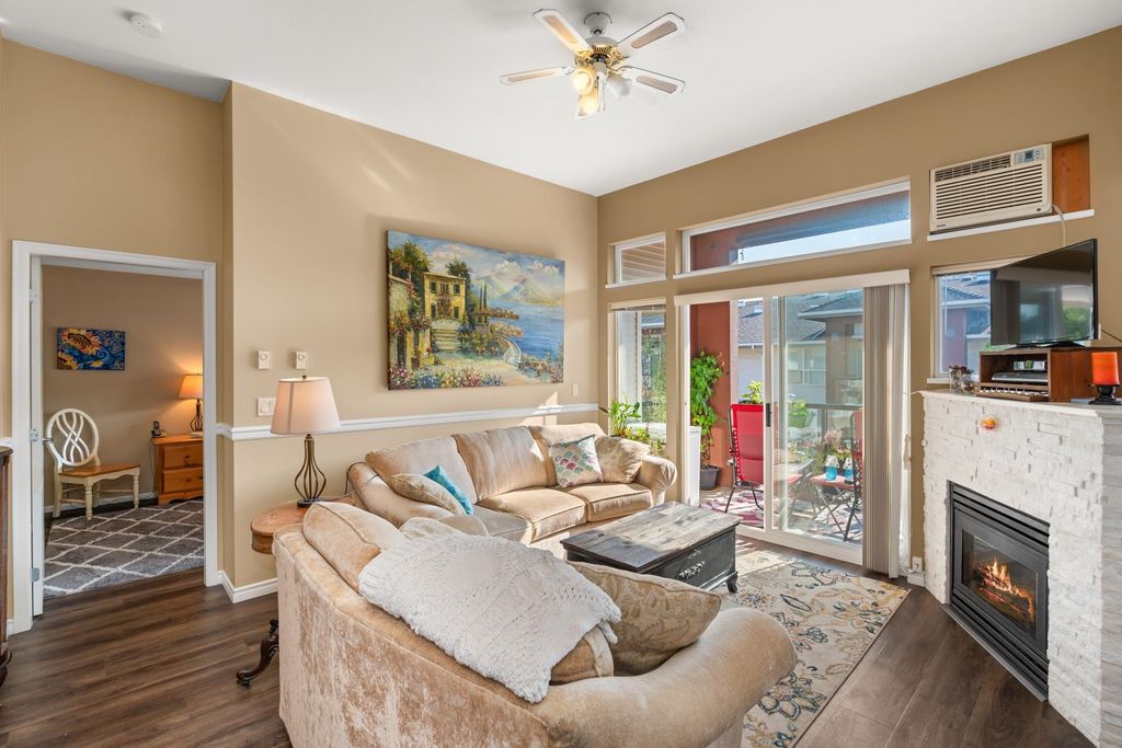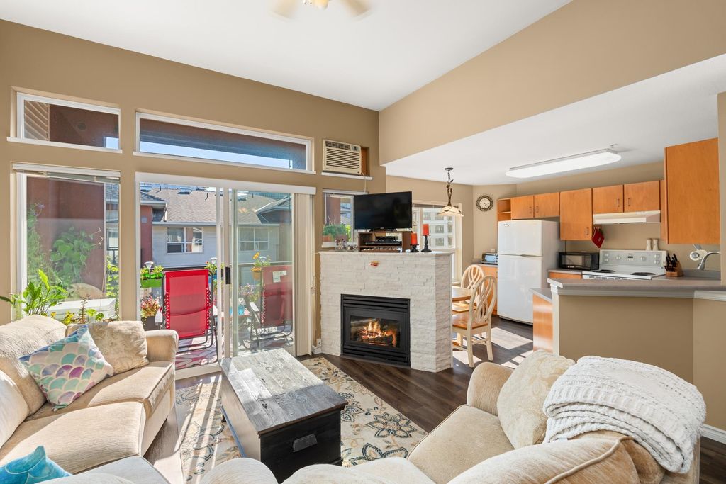 Top floor with 10 ft ceilings! This charming 2-bed, 2-bath corner unit includes a LARGE 9 x 7'6 ft den with a window. With 1,055 sqft of space, this home has abundant natural light with southwest exposure. Enjoy the privacy of bedrooms on opposite sides, sharing walls with only one neighbor. Features include an updated gas fireplace design in the living room, a recently replaced washer and dryer in a dedicated laundry room, and upgraded luxury vinyl plank floors. The large den with a big window has potential to serve as a third bedroom. Located close to walking trails, Brydon Lagoon, two blocks from the upcoming skytrain station, and within walking distance to shopping and restaurants.