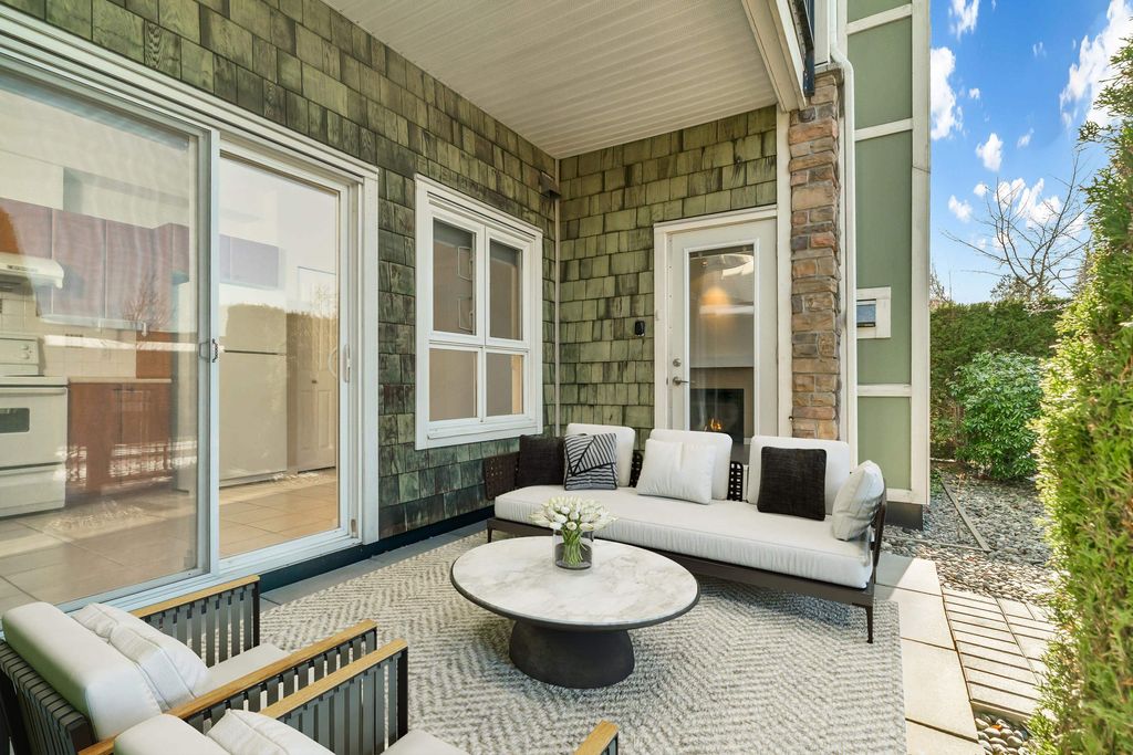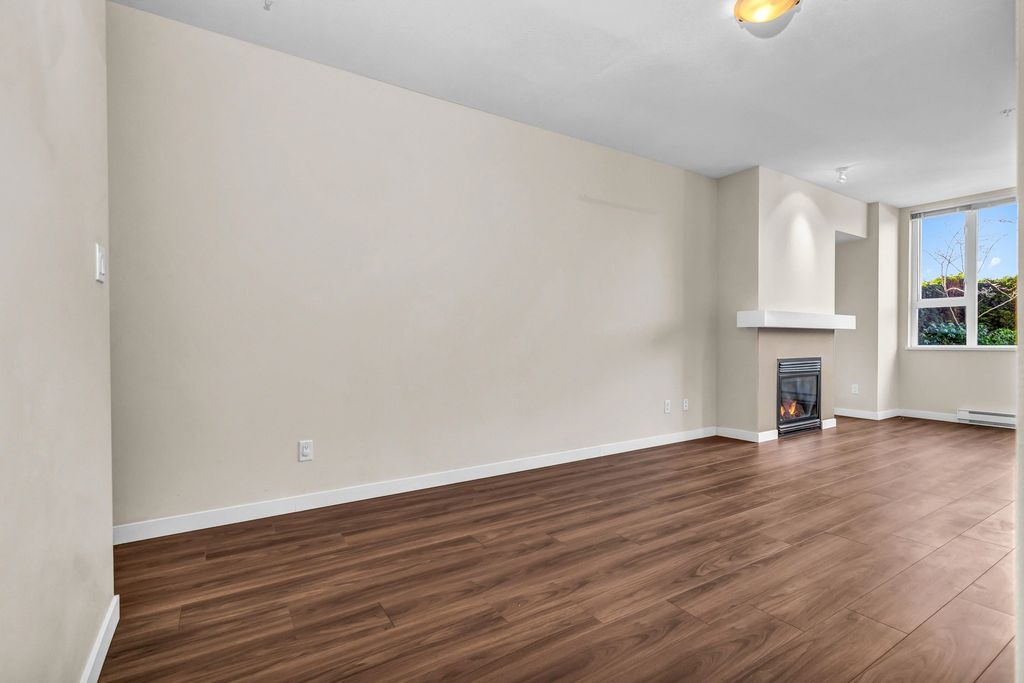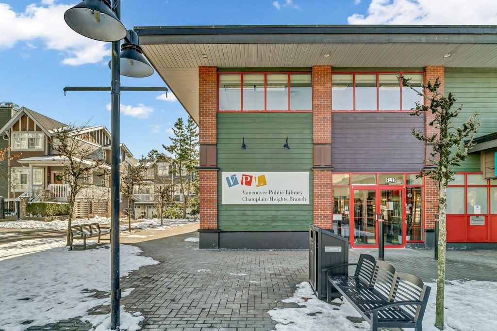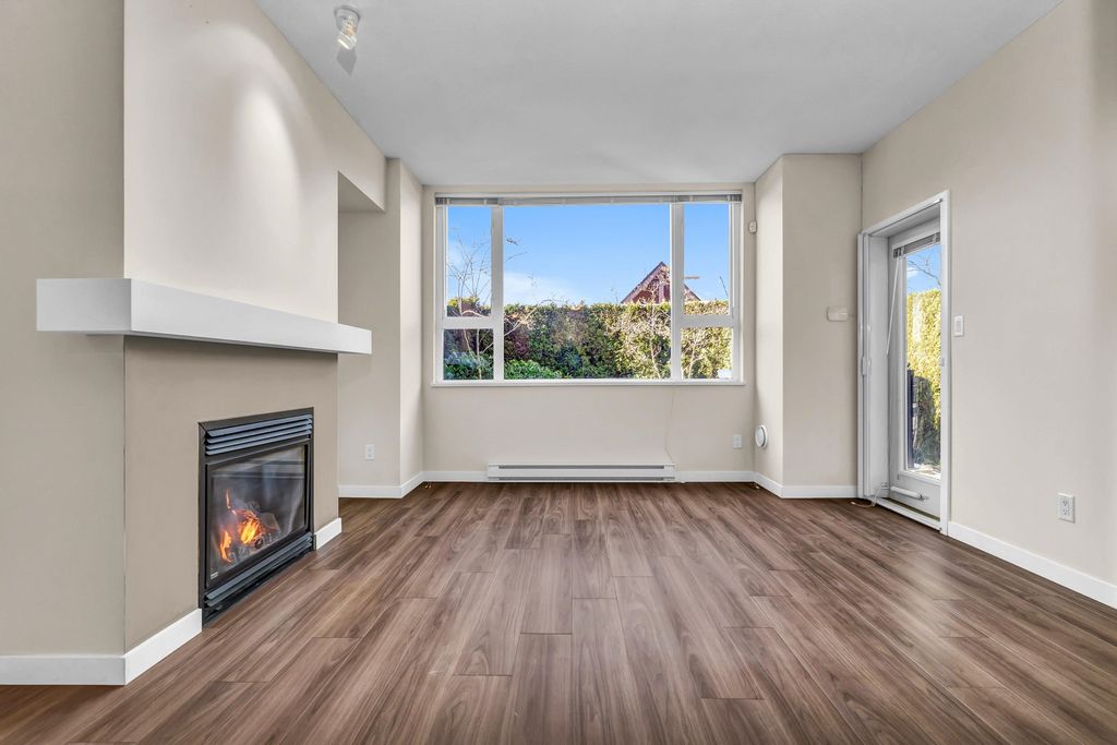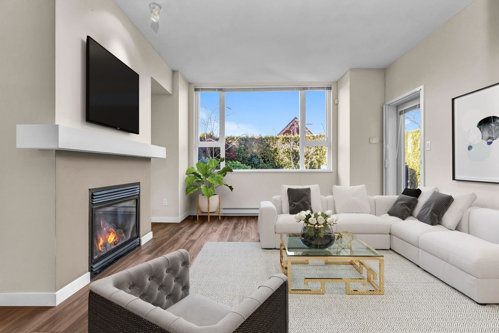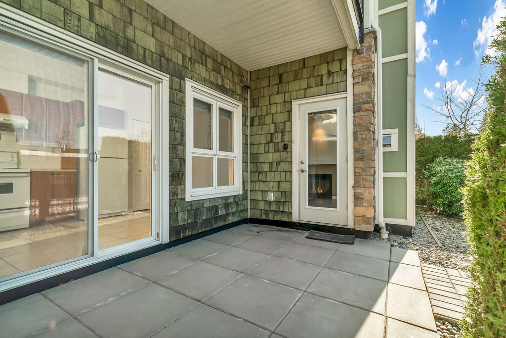 Welcome to CHAMPLAIN VILLAGE; RARELY available ground floor + corner unit w/ 2 BD & 2 BTH over 1000 sqft of living space! This well maintained 1 owner W facing unit features 2 entrances like a townhouse, a bright and sunny layout with kitchen that opens onto a huge wrap-around patio. New paint and new flooring throughout. Includes 1 underground parking, in suite laundry, & large living room w/ cozy gas fireplace. Proactive freehold building w/ gated visitors parking, bike room, recently replaced common area carpets & maint. fee includes hot water&gas! Steps to Champlain Mall, restaurants, groceries, library, Captain Cook Elementary, Killarney Secondary & Community Centre!
