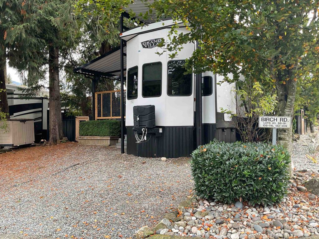 PRIME CORNER PARK MODEL LOT in Tapadera Estates with 2022 LUXURY Salem Grand Villa 39x13ft 2 STORY Destination Trailer that LIVES LARGE with 500+sf. A great vacation getaway close to the Fraser Valley or full-time snowbird living option. Spacious bedroom, Sleep Sofa & Recliners in lvgrm PLUS HUGE DOUBLE LOFT. Modern & Open with loads of cabinetry, residential appls., abundance of tall windows and high ceilings to take in the Mtn views and eagles. 2023 Upgrades of 6k ENTERTAINMENT SIZED Deck with (lifetime guarantee on epoxy coating) 20k Manuf. Alumin. Ramada Cover, 5K Custom cedar gates and fencing. Parking for 3 vehicles. LOW Maint. PRIVATE YARD, cedar hedges behind. Dual A/C. Powered Shed. $182 fees cover amazing amenities and inclusions. rentals, families and pets welcome! Call today!