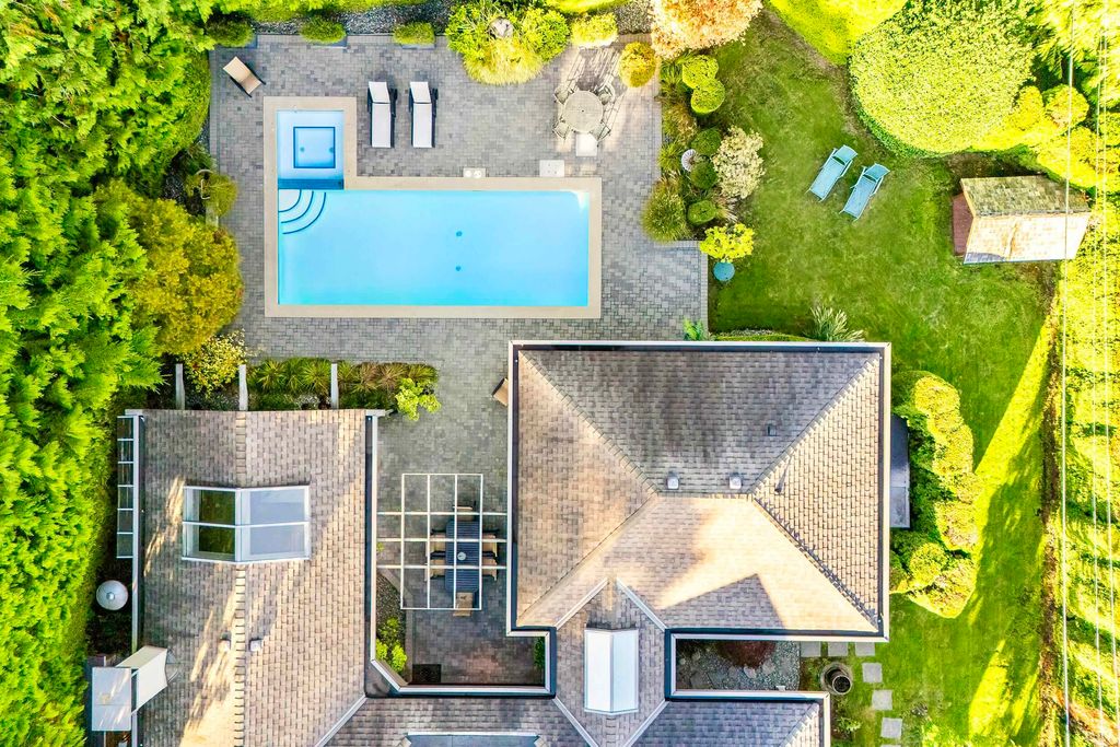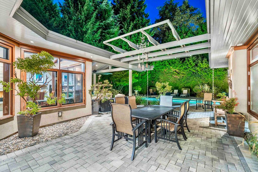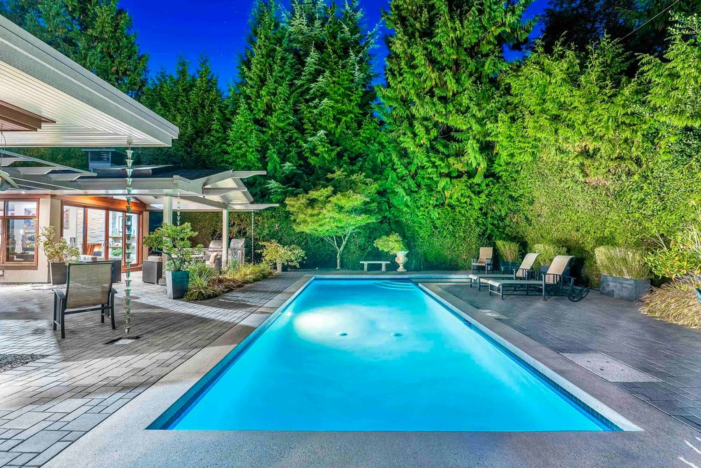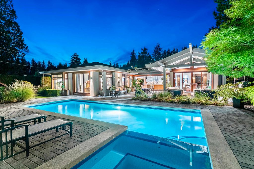 A masterpiece of modern luxury design, this 4,500 SF (Plus garage 488 SF) rancher by architect Trevor Euley blends architectural elegance with resort-style living. Set on a 14,400 SF impeccably landscaped lot, it features a soaring atrium living room, luminous dining with wine lounge, and a European walnut kitchen with state-of-the-art appliances. Accordion glass walls open to outdoor dining, kitchen, fireplace lounge, pool and spa. The private primary wing, past a serene zen garden, offers a spa-inspired ensuite and dressing area. A separate office with deck and flexible lower level for gym, nanny or media complete this rare offering near Capilano Golf, Hollyburn Club, Park Royal & top schools.