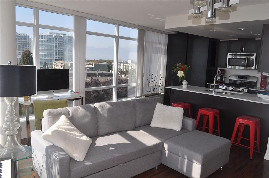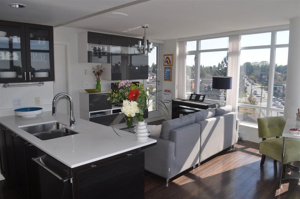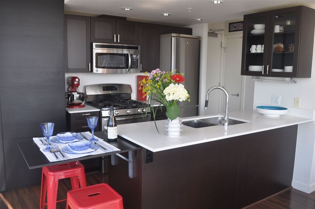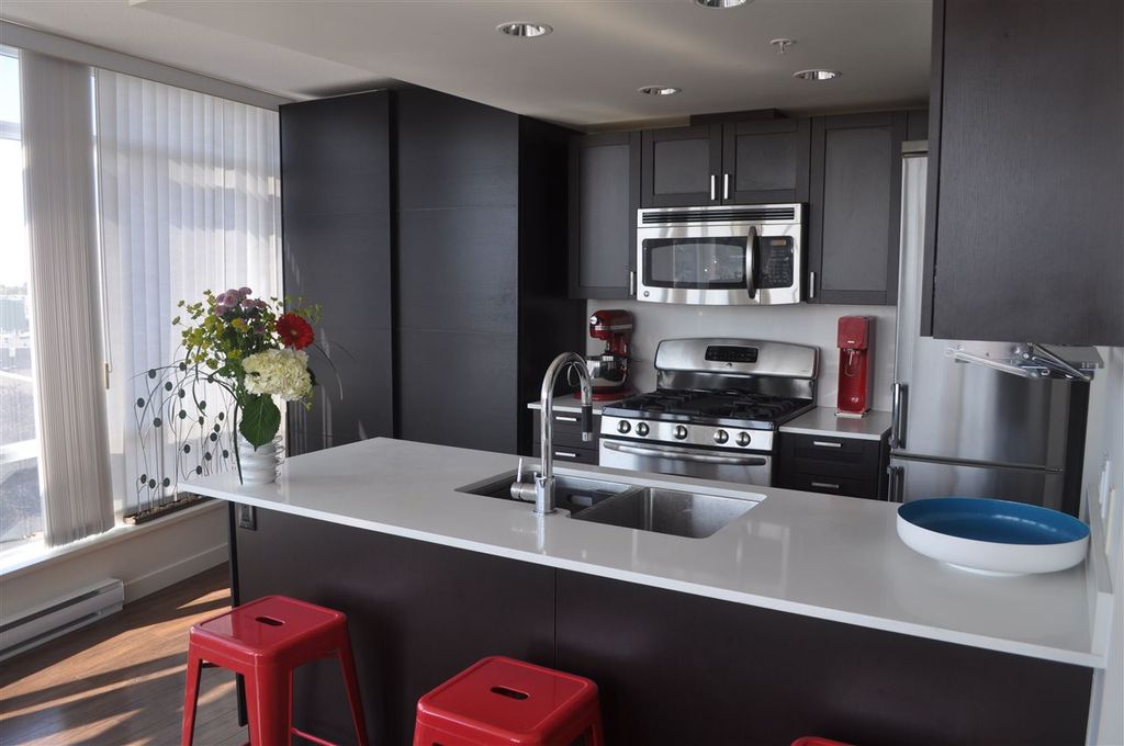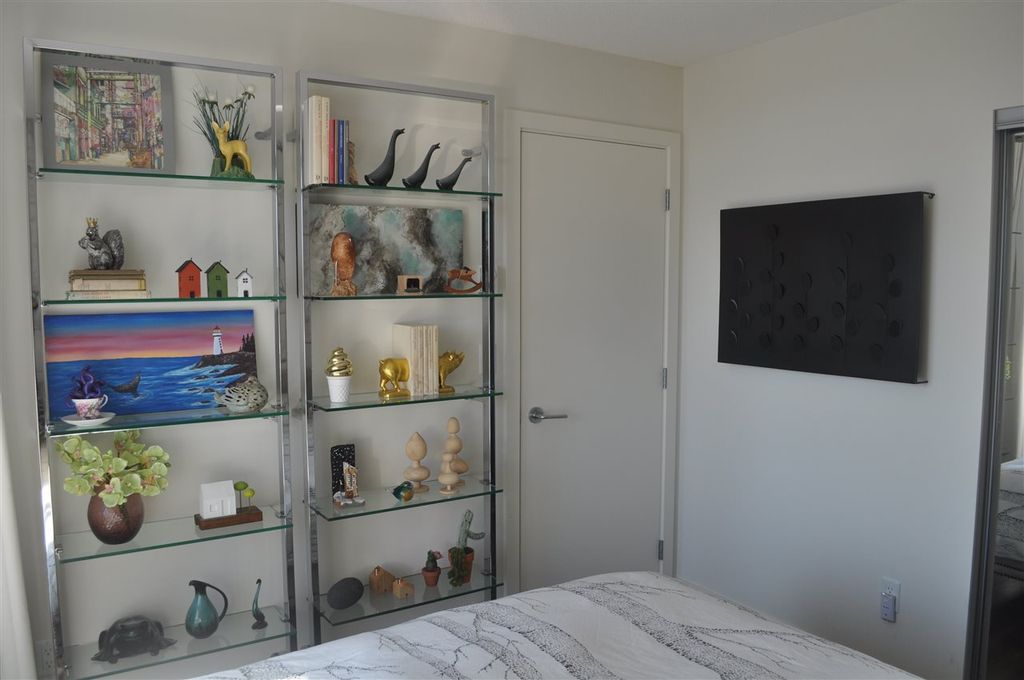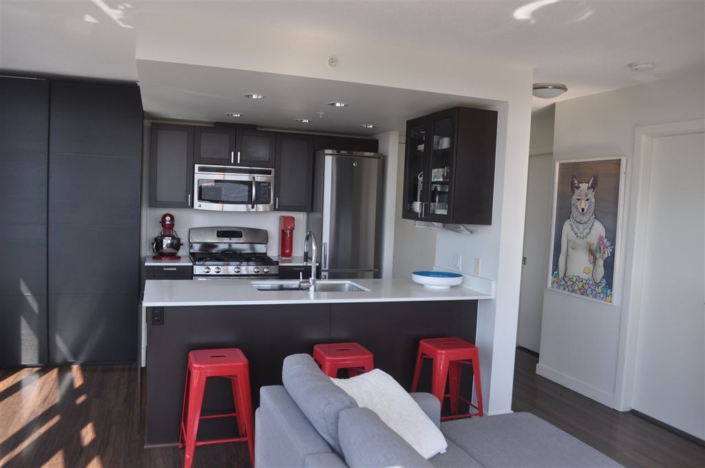 Extremely RARE is this sunny & bright, spacious & luxurious 1 bdrm 1 bath CORNER unit, in solid 6 yr old concrete building complete with balance of 2-5-10 warranty. With floor to ceiling expansive windows this south-west facing unit will "WOW" you with it's stunning unobstructed view & open floor plan. Designer highend features incl quartz & marble countertops, ss appliances incl gas stove, spa like tiled bathroom & wired fibre optic. Pride of ownership apparent with over $6,000 spent on extras incl one of a kind light fixture, custom cabinetry in living room, kitchen & bedroom as well as cupboard & closet organizers. Immaculately kept unit shows like NEW. Pets & rentals allowed (1 dog or 2 cats or 1 dog & 1 cat). Low strata fees.