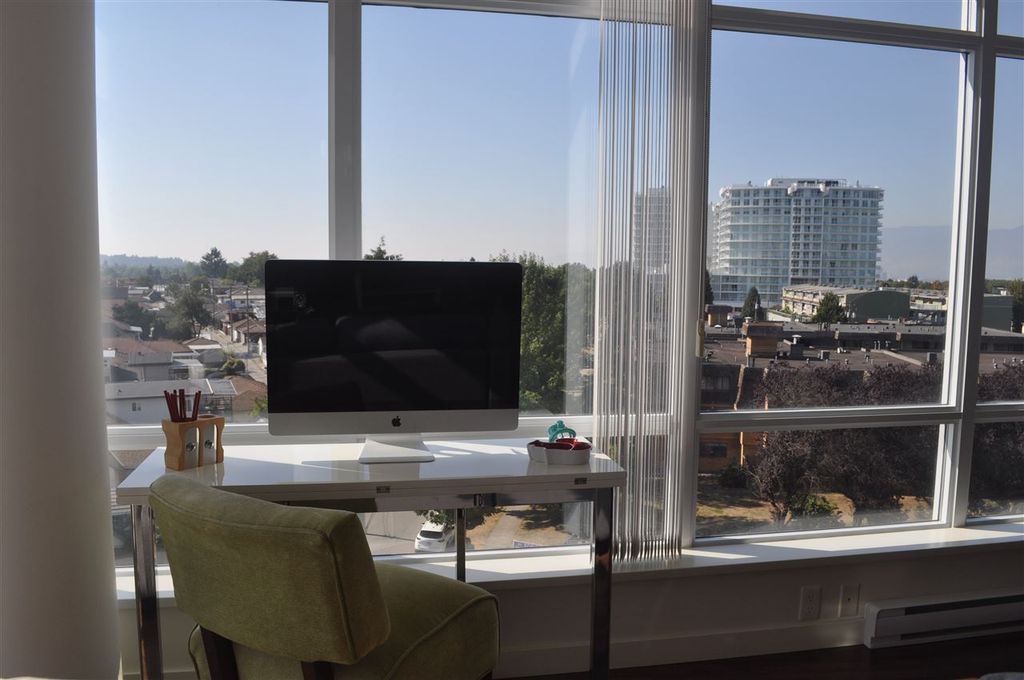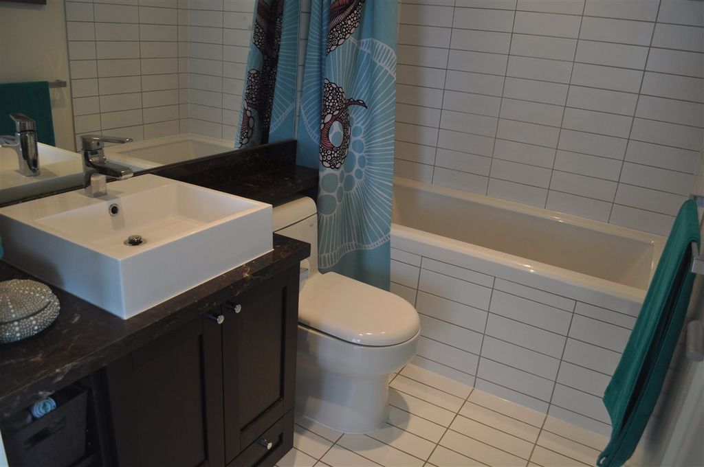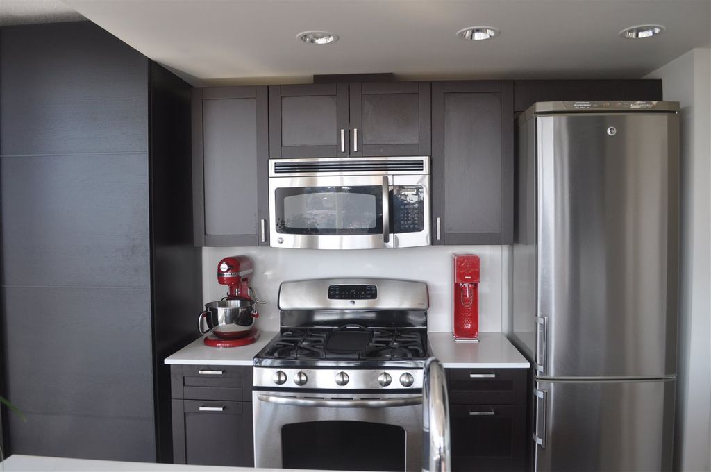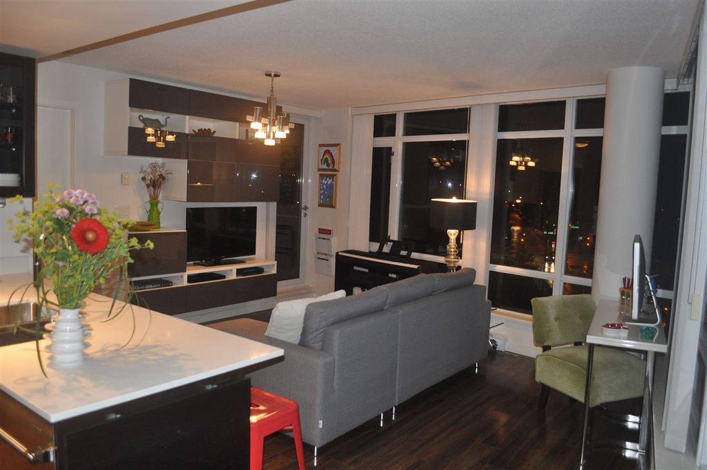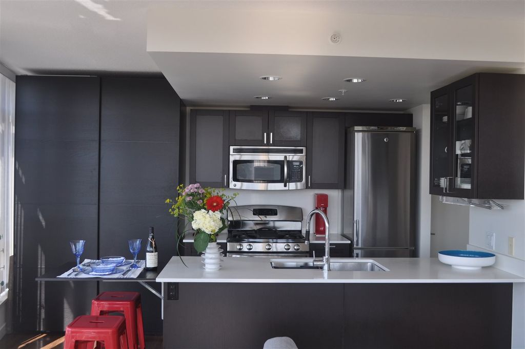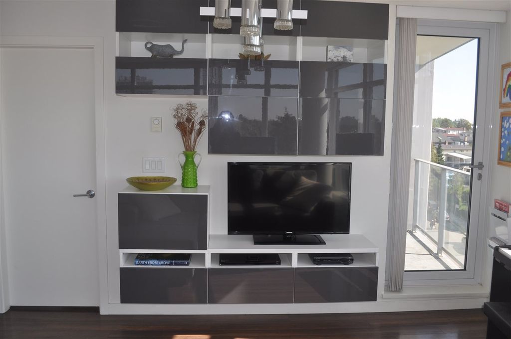 Extremely RARE is this sunny & bright, spacious & luxurious 1 bdrm 1 bath CORNER unit, in solid 6 yr old concrete building complete with balance of 2-5-10 warranty. With floor to ceiling expansive windows this south-west facing unit will "WOW" you with it's stunning unobstructed view & open floor plan. Designer highend features incl quartz & marble countertops, ss appliances incl gas stove, spa like tiled bathroom & wired fibre optic. Pride of ownership apparent with over $6,000 spent on extras incl one of a kind light fixture, custom cabinetry in living room, kitchen & bedroom as well as cupboard & closet organizers. Immaculately kept unit shows like NEW. Pets & rentals allowed (1 dog or 2 cats or 1 dog & 1 cat). Low strata fees.
