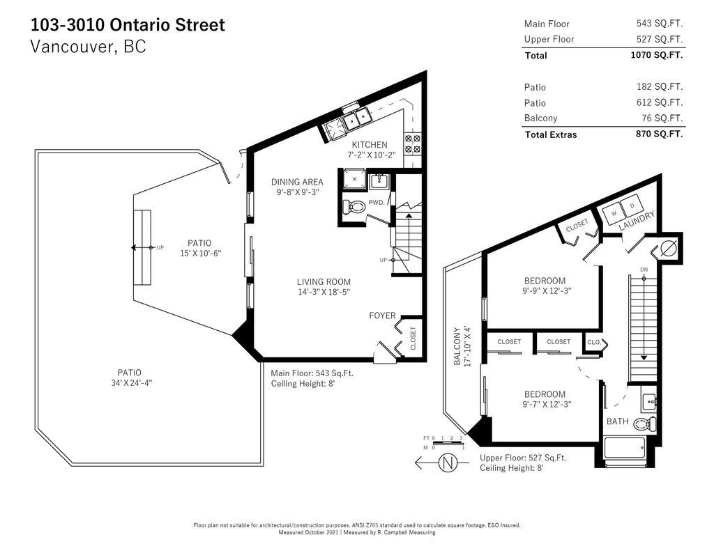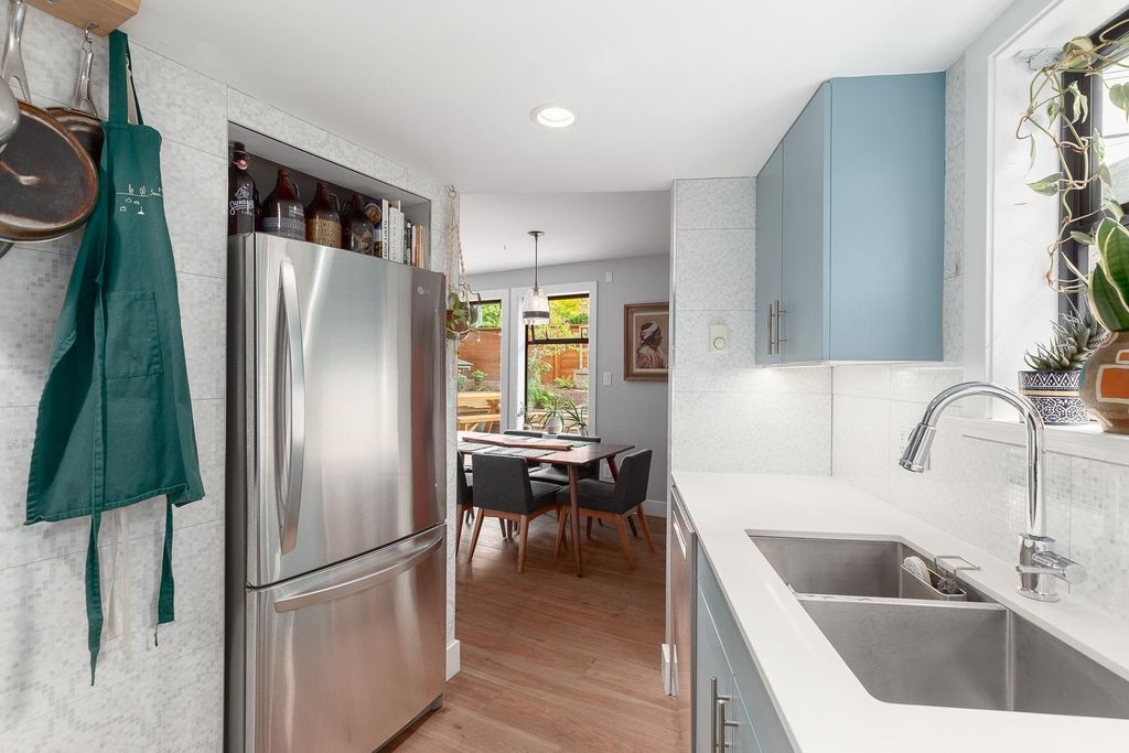 Welcome home to this quintessential Mount Pleasant sprawling 2-bed, 2 bath townhome w/ seamless indoor/outdoor living. Main floor feat. wide-plank, oak flooring installed in 2019 w/ a modern-style kitchen, dining & oversized living room w/ floor-to-ceiling windows. Large sliding door & windows provide tons of natural light into this beautiful living space w/ views & steps to a 794 sf private outdoor terrace, your perfect outdoor oasis to relax/entertain. Upstairs, you will find 2 large beds, in-suite washer/dryer & spacious 4 pc bath, beautifully reno'd in 2021. Relax on upper balcony for ultimate private hideaway from Master bed. Spacious 2nd bed is ideal for home office & great for a live/work lifestyle. Bonus powder on main. Pro-active strata, 1 parking, 1 locker + bike storage.