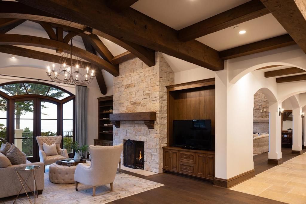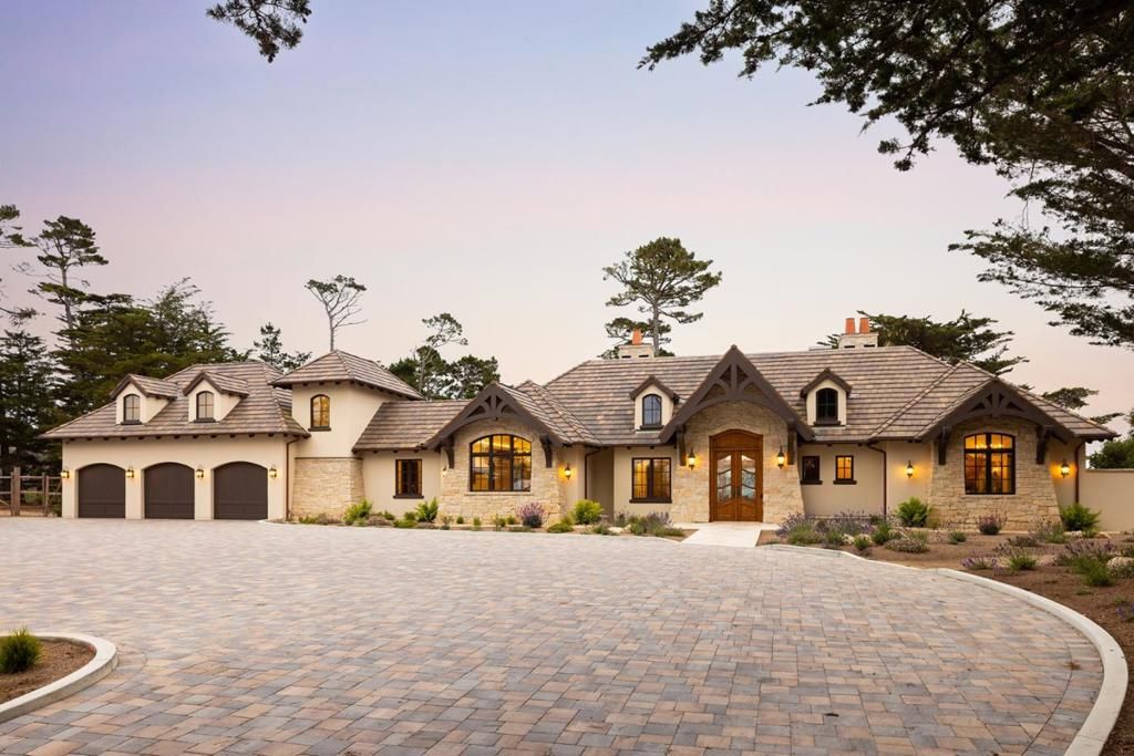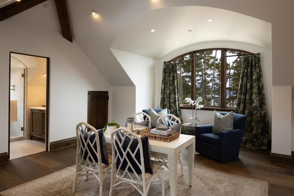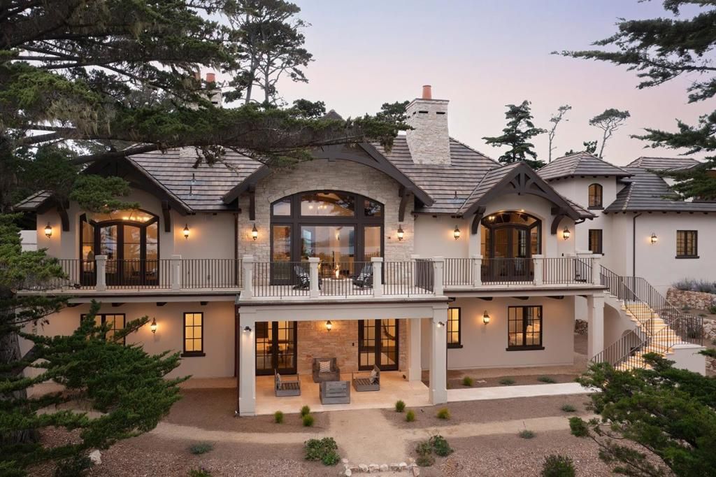 Experience timeless French country elegance at this 6,402+/- sq.ft. estate in Pebble Beach, crafted by Randy Wallis and designed by Jun Sillano of IDG. Set on 1.35 acres with panoramic views from Point Lobos to Point Sur in Big Sur and the coastline in between, this 5-bed, 6.5-bath home offers refined living in a private coastal setting. The stone entry opens to a grand living room with wide-plank wood floors, oak built-ins, and Ironware chandeliers. The gourmet kitchen features honed marble counters, Thermador appliances, a wood-clad hood, and walk-in pantry, all adjacent to a cozy family room with fireplace. A main-level primary suite includes French doors to the deck, walk-in closets, and a spa-like bath with Palomino granite and walk-out patio. Other features include an elevator connecting the main levels, a guest suite with ocean views, and a lower level with game room, multiple ensuite bedrooms, laundry, and radiant heat throughout. The 920+/- sq.ft. 3-car garage has dual EV chargers. Exterior highlights include fire pit, ocean-facing deck, uplighting, bronze railings, and room for a pool or guest unit. Quietly nestled among oaks with privacy and potential for expansion, this is Pebble Beach luxury at its finest.