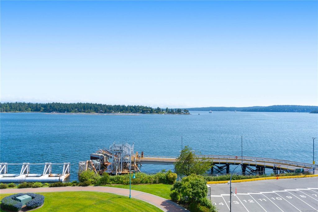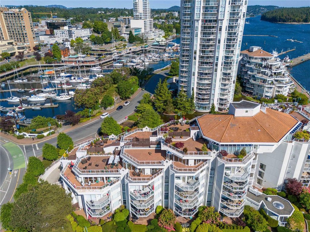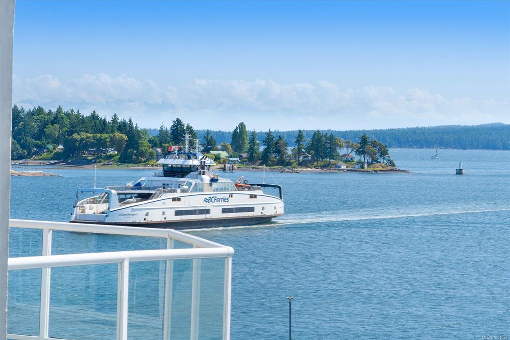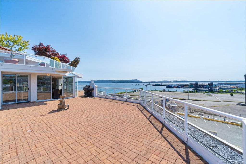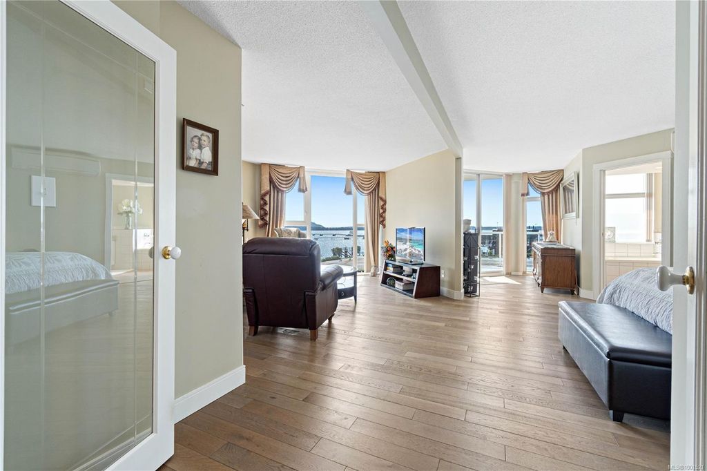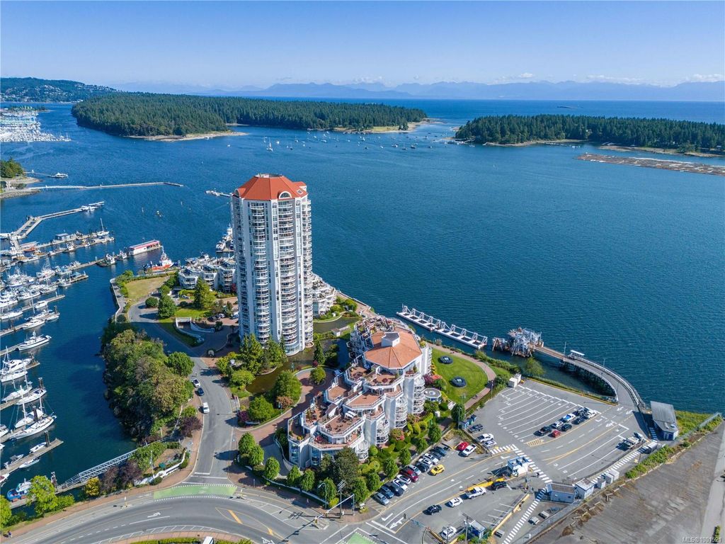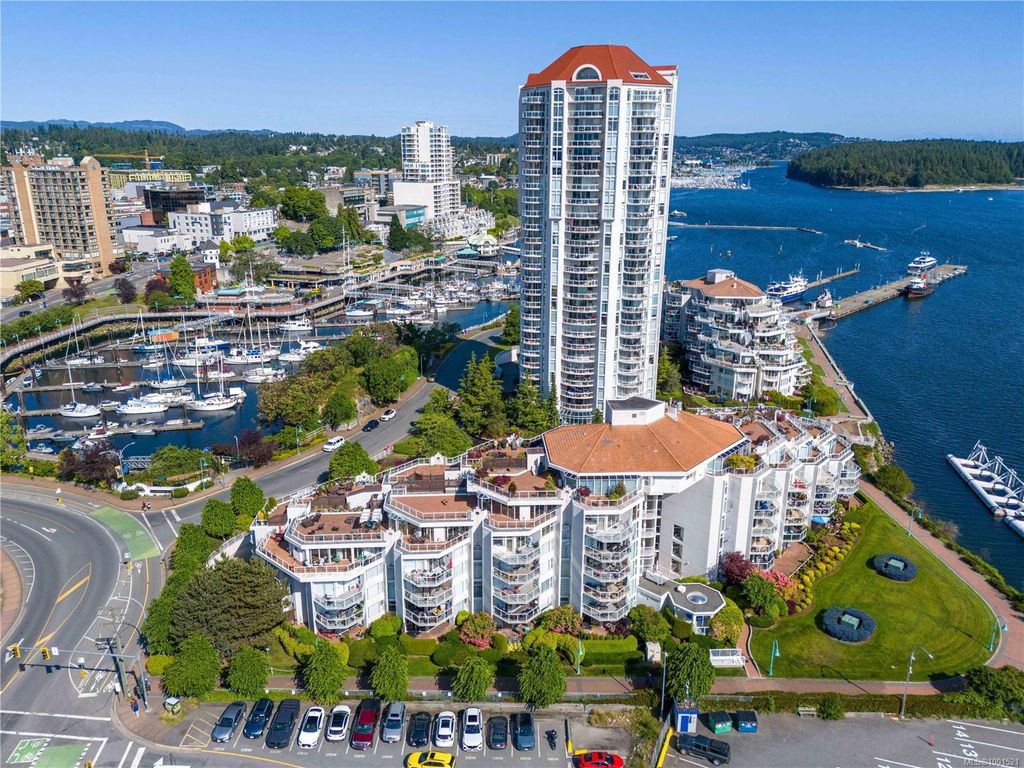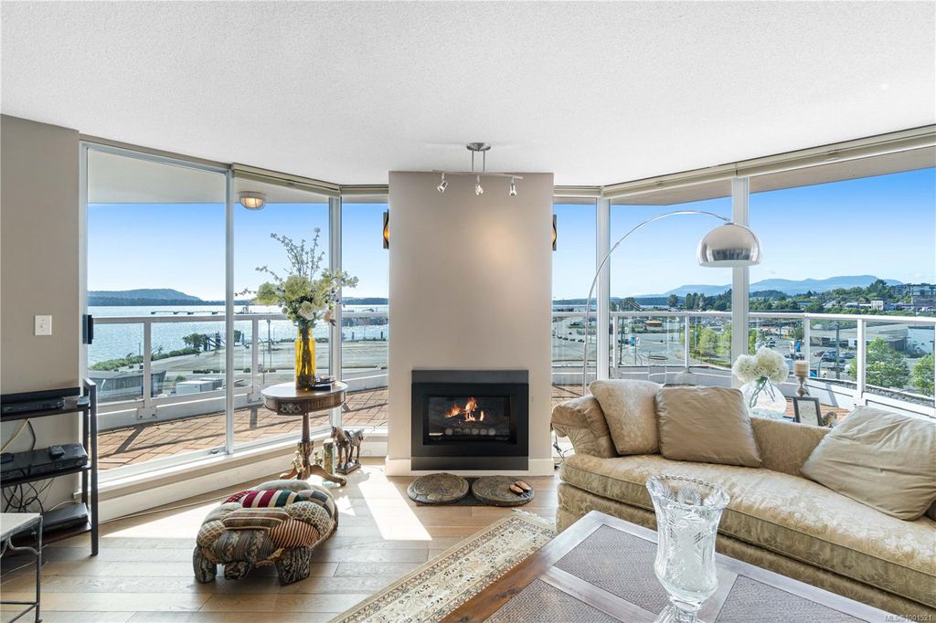 Experience luxury living in the “Gabriola” on Cameron Island, along Nanaimo’s Harbourfront Promenade! This 1,742 sq ft condo offers stunning views of Mount Benson, city lights, and the inner harbour through south and east facing floor-to-ceiling windows. The open-concept living room, dining room, and kitchen create an ideal space for entertaining. Relax by the gas fireplace or step out onto the expansive 900 sq ft patio to enjoy the panoramic views. Numerous updates include beautiful hardwood floors throughout. The kitchen features stone countertops and updated cabinetry with ample storage. The spacious primary suite, with a 4-piece ensuite, double closets, sitting area, and balcony was created by combining two bedrooms and can be restored to its original layout. Additional features include a den, heat pump, in-suite laundry, two underground parking stalls, and a storage locker. Walk to shopping, dining, and entertainment with easy access to floatplane and ferry service to Vancouver.