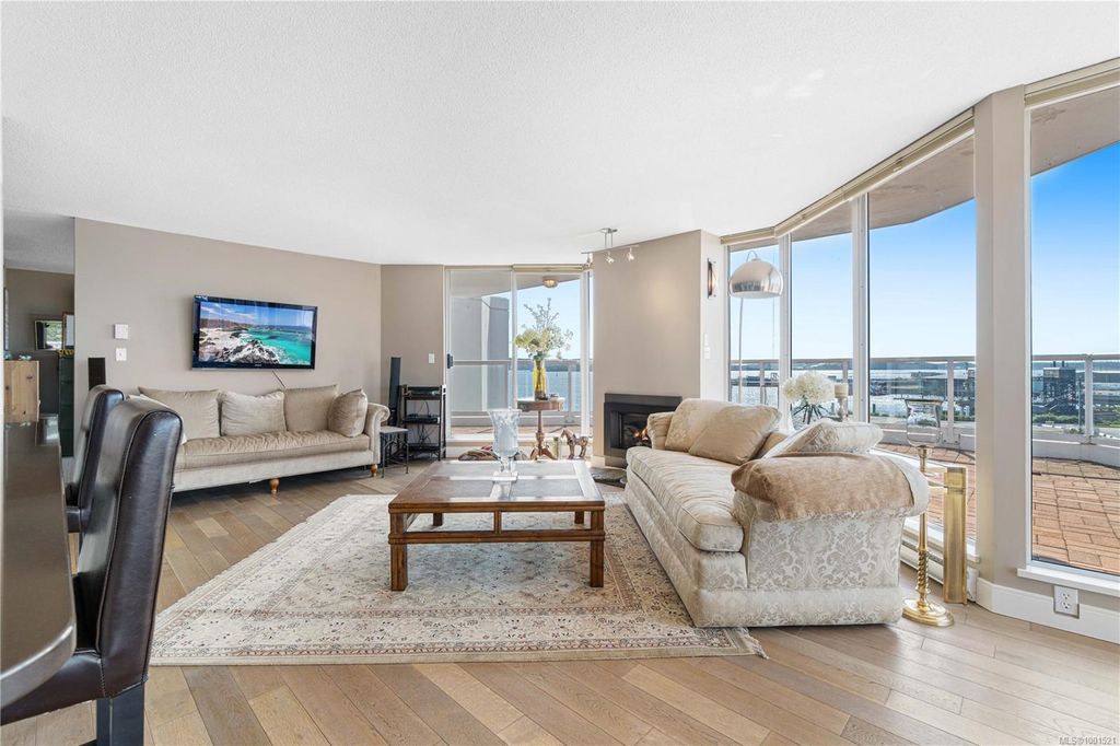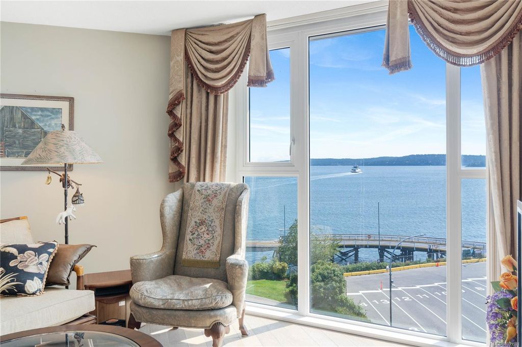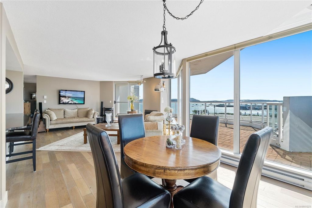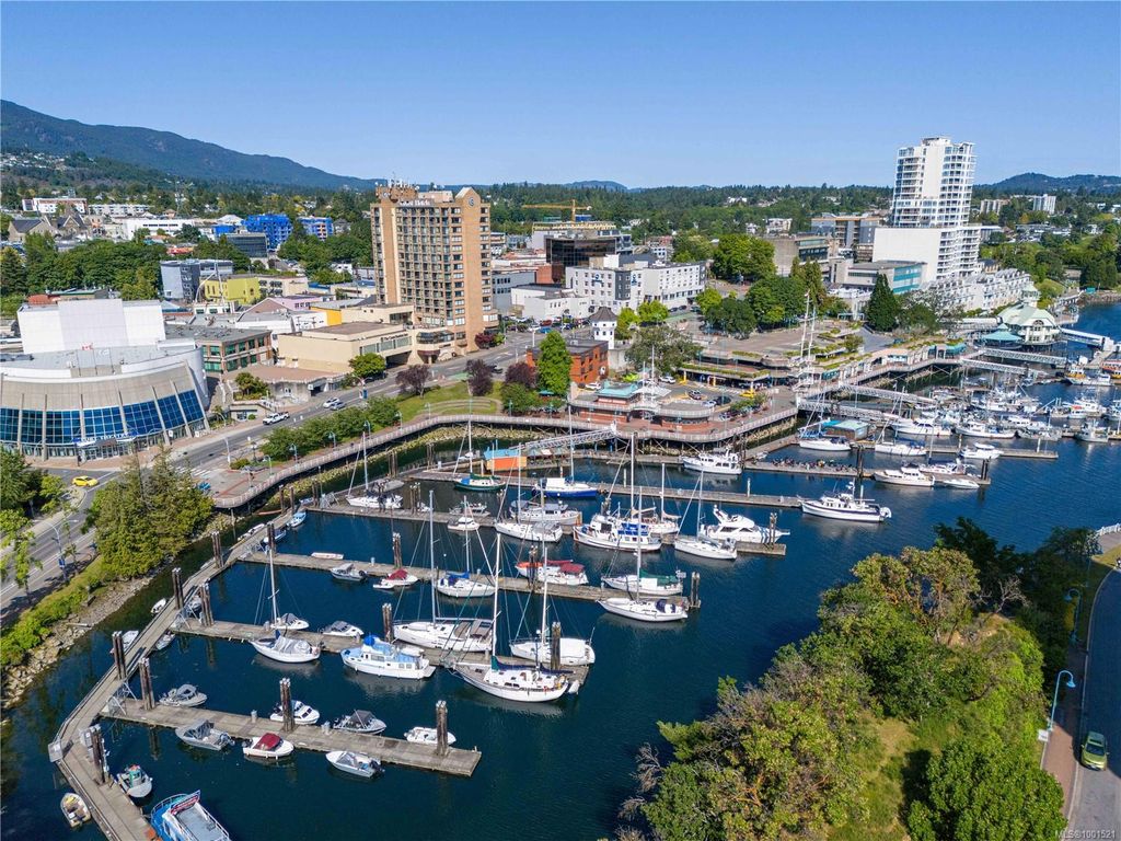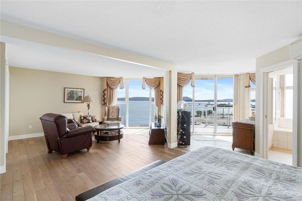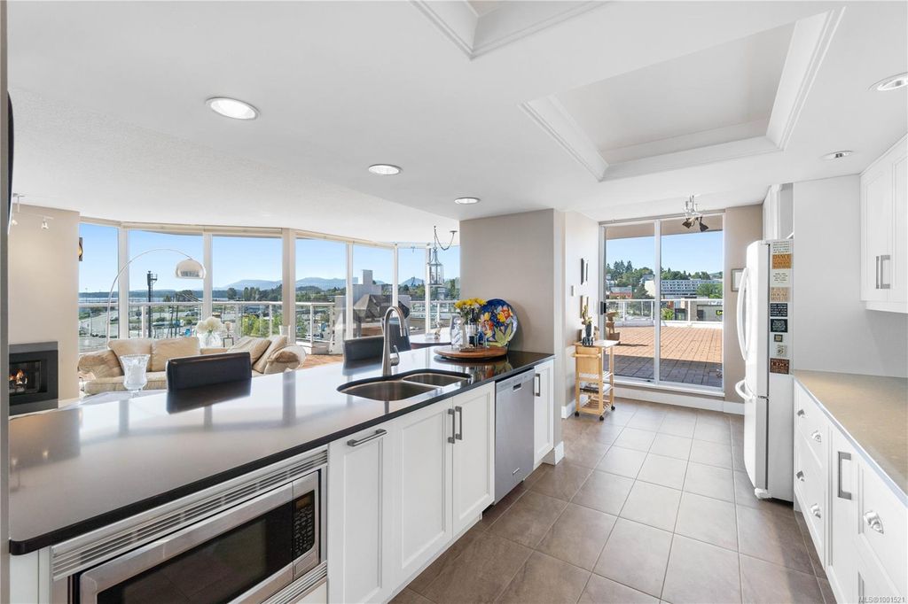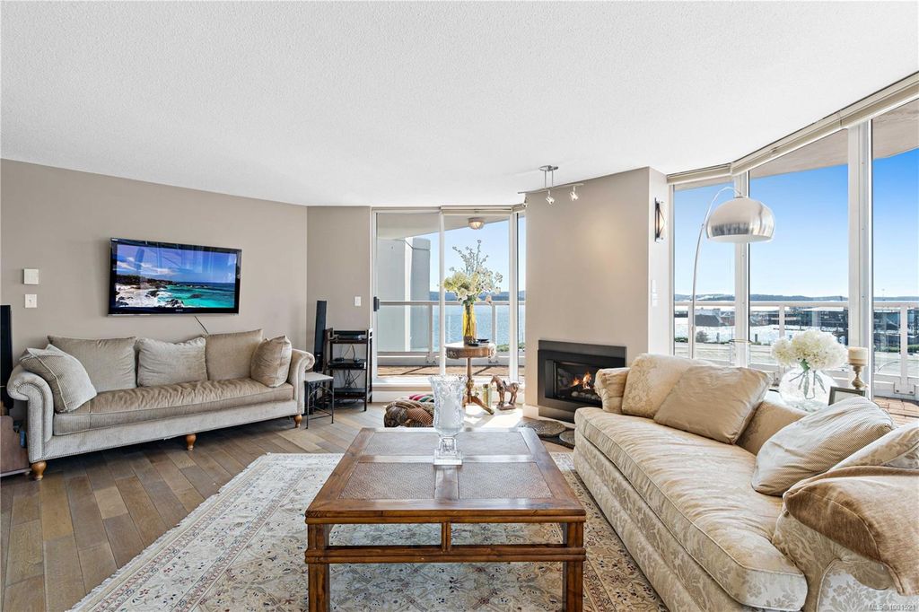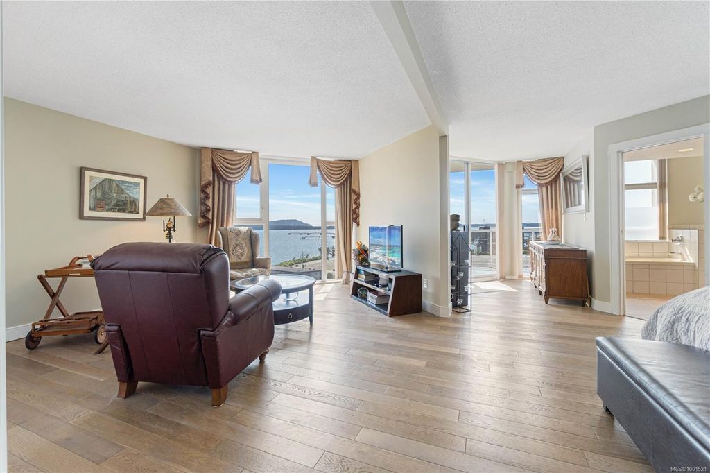 Experience luxury living in the “Gabriola” on Cameron Island, along Nanaimo’s Harbourfront Promenade! This 1,742 sq ft condo offers stunning views of Mount Benson, city lights, and the inner harbour through south and east facing floor-to-ceiling windows. The open-concept living room, dining room, and kitchen create an ideal space for entertaining. Relax by the gas fireplace or step out onto the expansive 900 sq ft patio to enjoy the panoramic views. Numerous updates include beautiful hardwood floors throughout. The kitchen features stone countertops and updated cabinetry with ample storage. The spacious primary suite, with a 4-piece ensuite, double closets, sitting area, and balcony was created by combining two bedrooms and can be restored to its original layout. Additional features include a den, heat pump, in-suite laundry, two underground parking stalls, and a storage locker. Walk to shopping, dining, and entertainment with easy access to floatplane and ferry service to Vancouver.