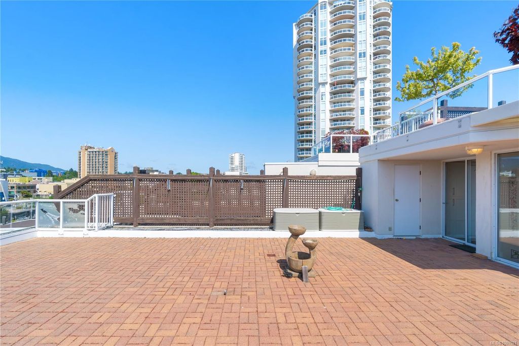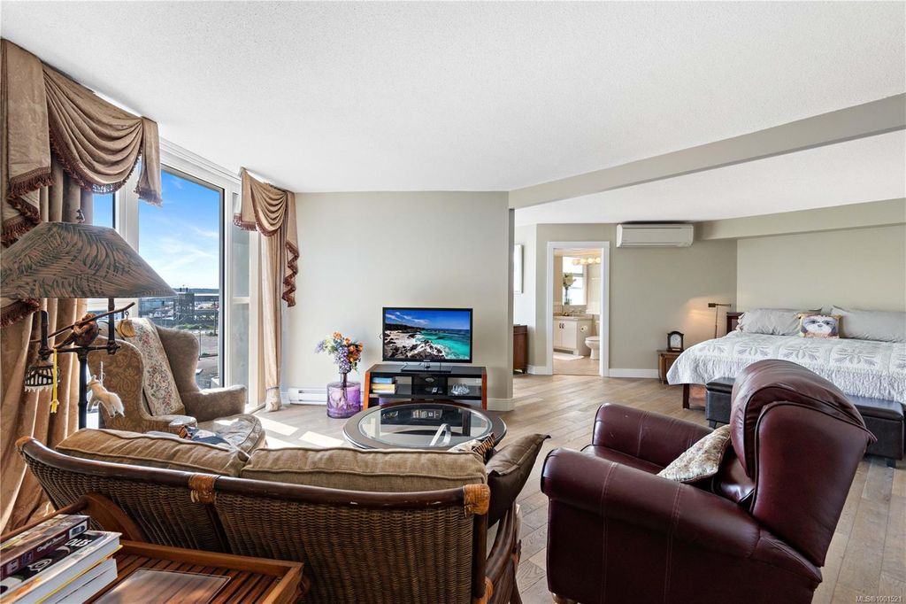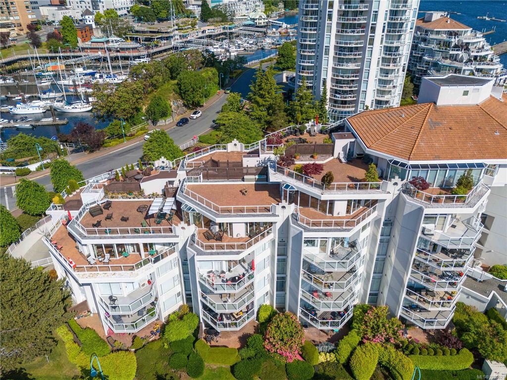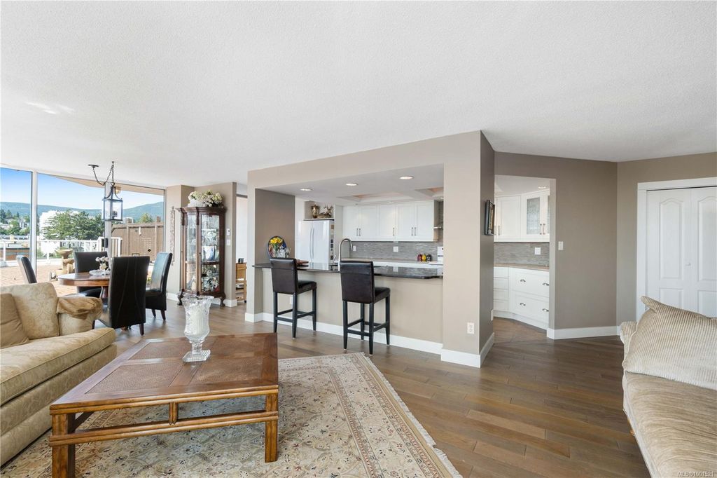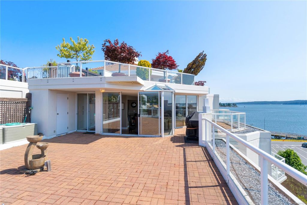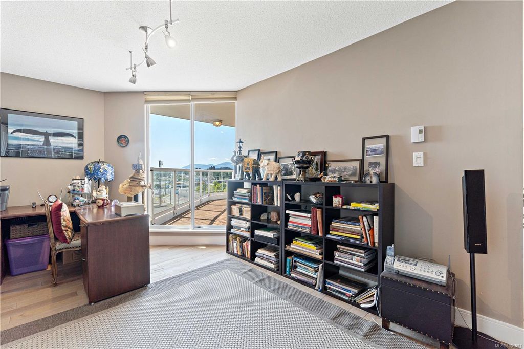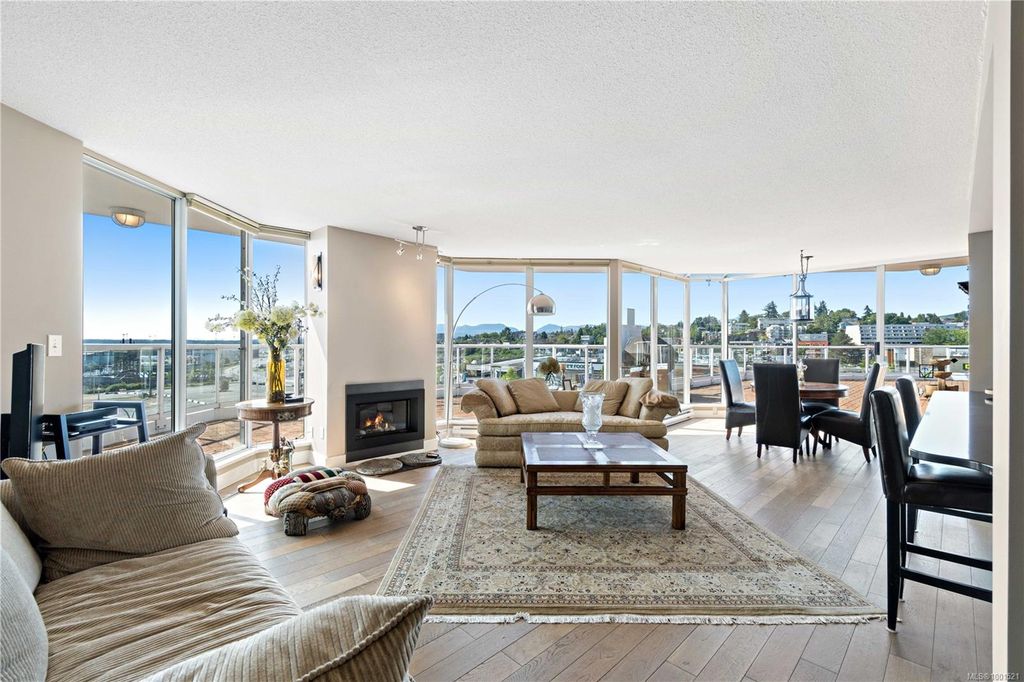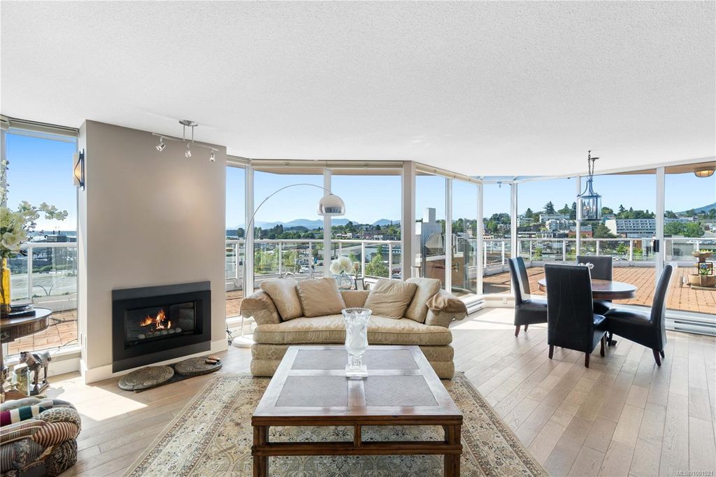 Experience luxury living in the “Gabriola” on Cameron Island, along Nanaimo’s Harbourfront Promenade! This 1,742 sq ft condo offers stunning views of Mount Benson, city lights, and the inner harbour through south and east facing floor-to-ceiling windows. The open-concept living room, dining room, and kitchen create an ideal space for entertaining. Relax by the gas fireplace or step out onto the expansive 900 sq ft patio to enjoy the panoramic views. Numerous updates include beautiful hardwood floors throughout. The kitchen features stone countertops and updated cabinetry with ample storage. The spacious primary suite, with a 4-piece ensuite, double closets, sitting area, and balcony was created by combining two bedrooms and can be restored to its original layout. Additional features include a den, heat pump, in-suite laundry, two underground parking stalls, and a storage locker. Walk to shopping, dining, and entertainment with easy access to floatplane and ferry service to Vancouver.