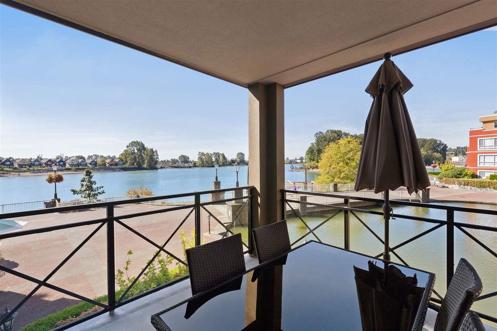 One of the best “High End” renos at New Westminster Quay! Complete new kitchen $33,165 & two bathrooms $22,579. New wide plank engineered hardwood & porcelain tile flooring: $23,724. SW corner unit w/15x12 deck offers calming frontline VIEWS of the Lido lagoon w/fountain, Fraser River & Poplar Island! Secure courtyard entrance to own private door. The 15FT open-to-below foyer shows off new modern metal/glass railings. Open concept kitchn w/sleek dark cabinets extend to ceiling, textured wavy tile back-splash, wide white Corian counter-tops, glass cook-top, wall-mounted oven/microwave. 9FT ceilings thru-out. Striking floor-to-ceiling porcelain tile in bath showers/feature walls. All new freestanding tub, int doors, mouldings, light fixtures, window coverings, & more.