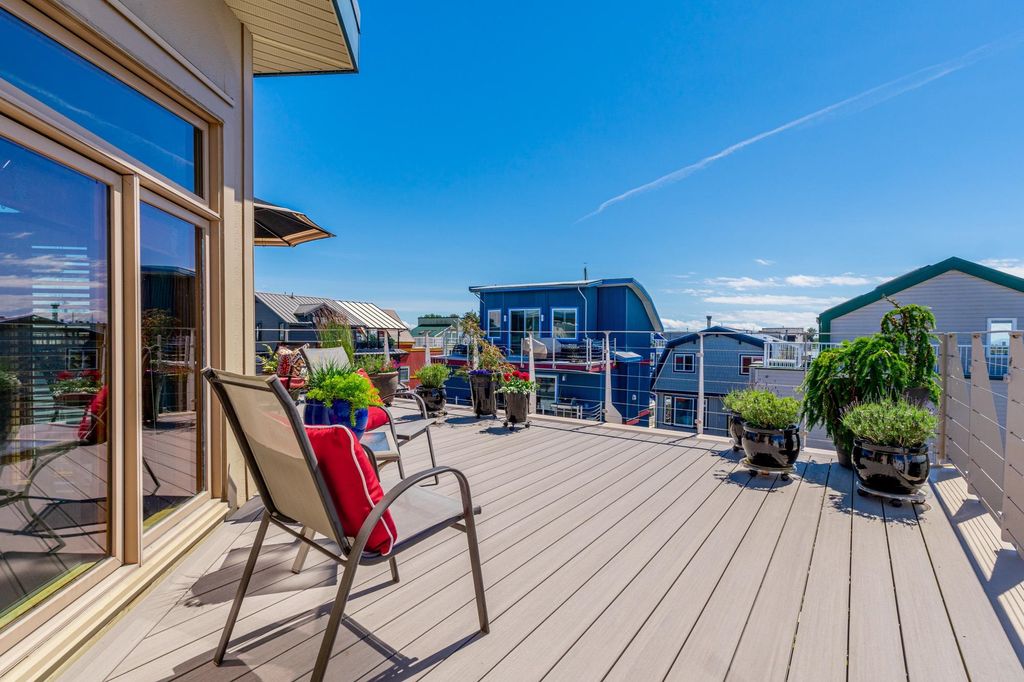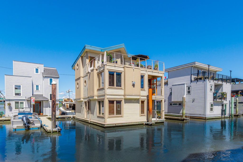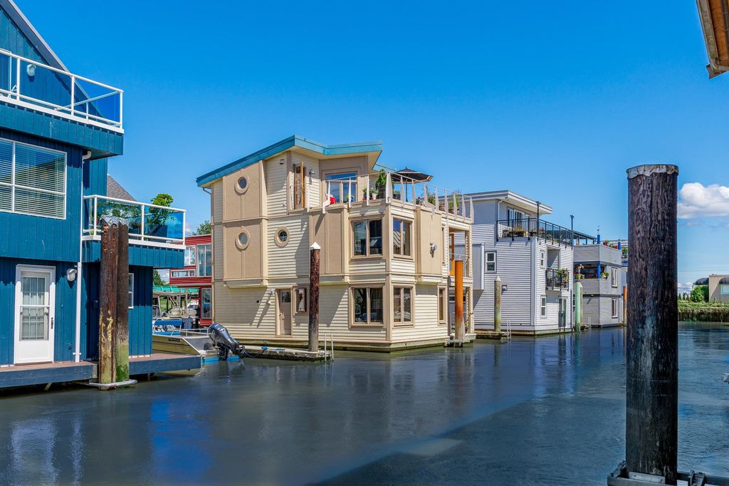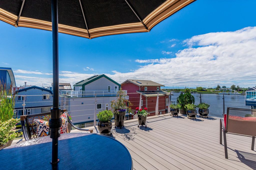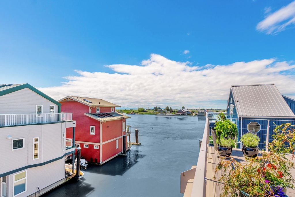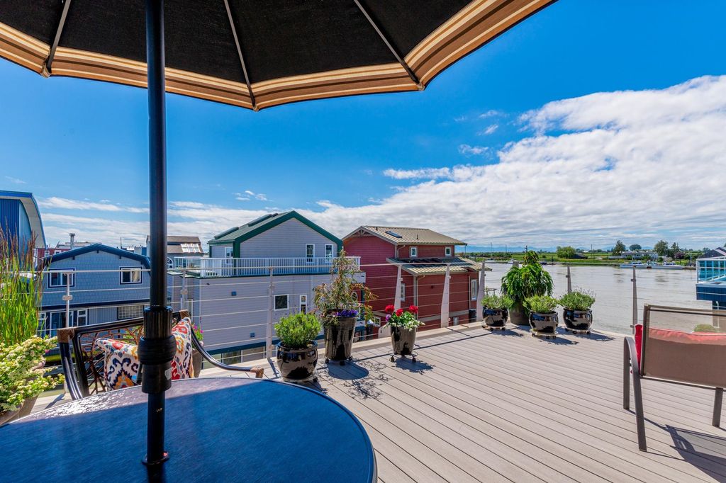 Unique custom built float home, located on the peaceful Fraser River in Marina Wes-Del, minutes from Ladner Village, Westham Island...surrounded by the water and nature. Incorporating European craftsmanship and a careful attention to detail-reclaimed hardwood floors (2.5"), engineered beams,Hemlock windows, 2x6, open staircase, filled with light and a choice of three balconies/decks! Open concept cooks kitchen (gas stove, s/steel appliances, granite c/tops) with adjacent living/dining areas. Master suite on top level, 3 pce ensuite (heated floors). Lower level has two more bedrooms and full bath + guest bath on main. Roof top 325sf deck is stunning with endless views year-round! Moorage for 32' boat+2 parking stalls (garage+open).IMF concrete float (positive floatation). Shows like new!
