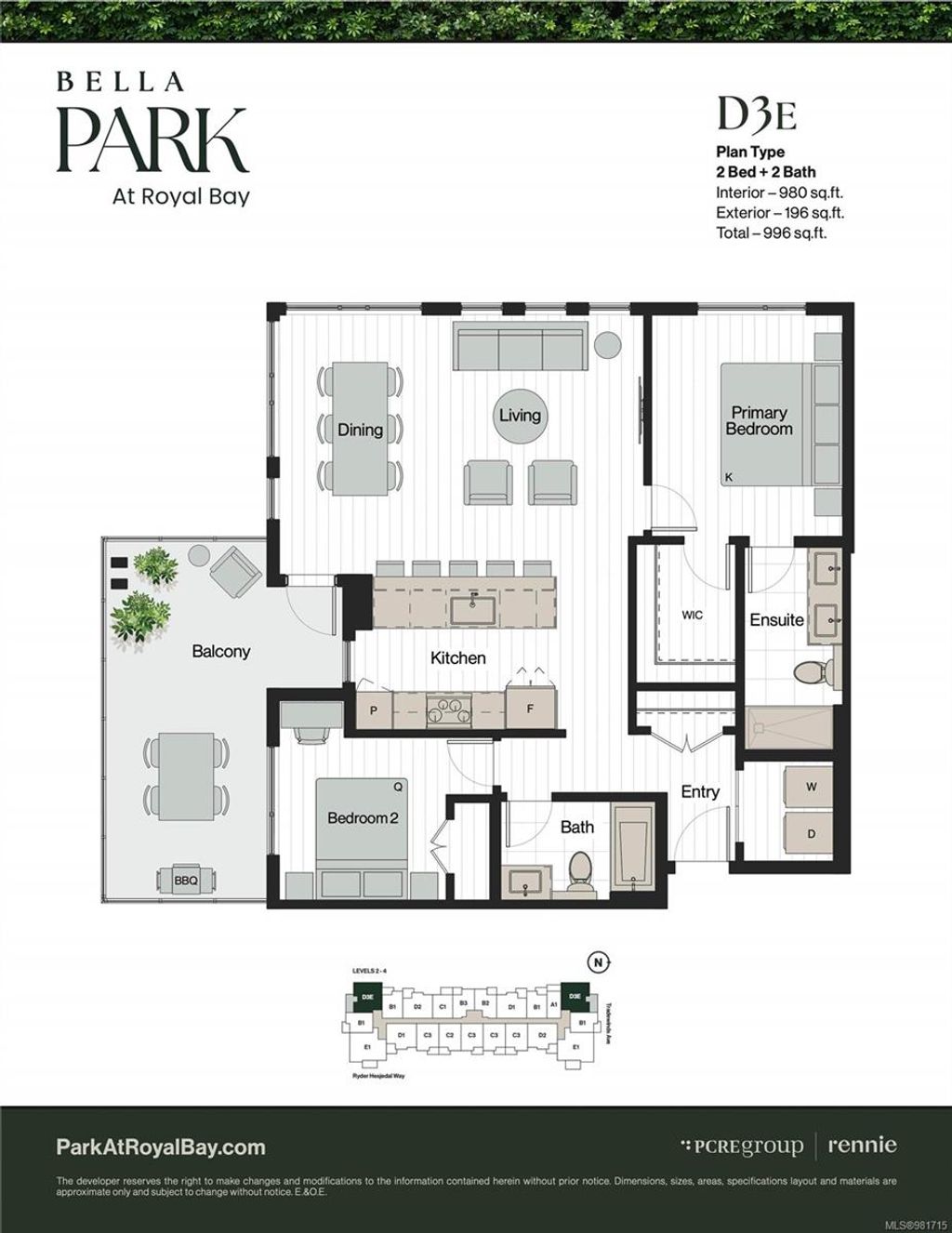 Discover the exceptional D3E residence at Bella Park—a bright and spacious 2-bedroom, 2-bathroom corner home offering 980sqft of thoughtfully designed living space. With coveted south/western exposure, this residence is bathed in natural light throughout the day, complemented by over-height ceilings and a generous patio that enhances the airy ambiance. The chef-inspired kitchen is a culinary dream, featuring Silestone quartz countertops, stainless steel appliances, an induction cooktop, and ample storage. Bella Park residents enjoy exclusive access to the Clubhouse, which includes a social lounge, fully-equipped fitness center, yoga space, outdoor hot tub, sauna, cold plunge, and outdoor shower. Bella Park offers over 2 acres of lush green space, community gardens, and bocce court. Modern conveniences include the Innova 2.0 cooling system, EV-ready parking, and a guest suite. Bella Park enjoys a prime location steps from the vibrant Commons and the picturesque oceanfront. Price + GST.