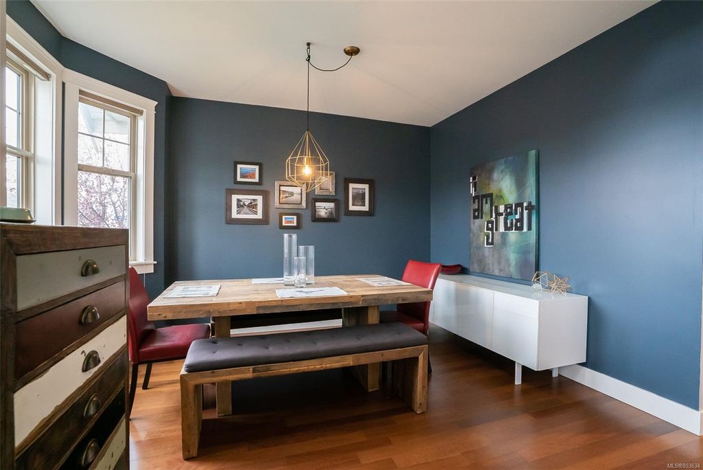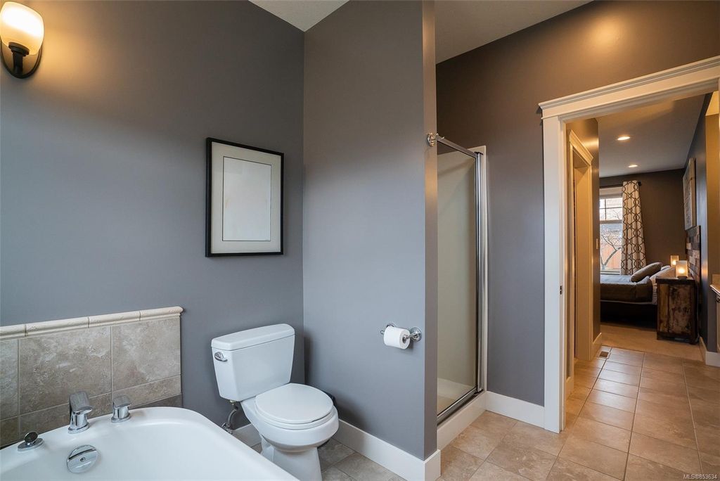 This level entry 2 storey home boasts the master bedroom on the main level with window overlooking the rear yard, plus a 5 piece ensuite. The great room design has an island kitchen, quality appliances, Shaker style cabinetry, and pendant lighting. The dining room enjoys natural light, French doors onto the wrap around rear deck; the living room enjoys a gas fireplace feature wall. Sitting room off foyer, powder room, mud room to the garage and rear deck, new gas HWT and interior paint, laundry room (upgraded washer/dryer), and hard wood floors. The upper level includes two more bedrooms, full bathroom, plus a landing area (13'x11') ideal for an office, media, or study. The exterior is recently painted and has a single garage. The rear yard: fire pit, BBQ hook-up, and wrap-around composite deck. Unique exposed rock, lawns, shrubberies, and garden shed. The location is surrounded by parks and walking trails. All measurements are approximate & should be verified if important.