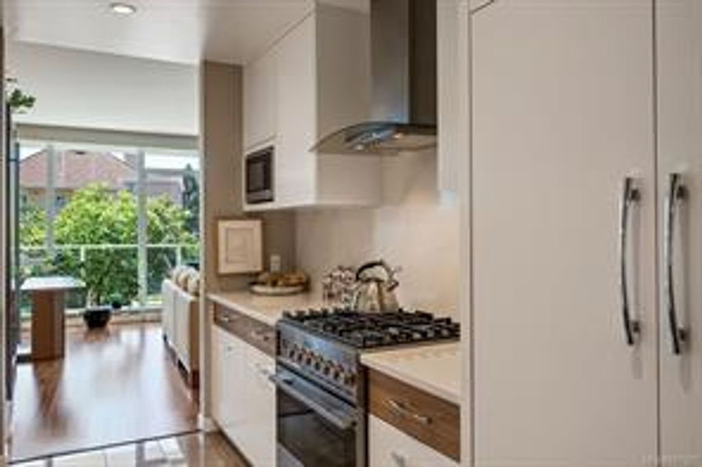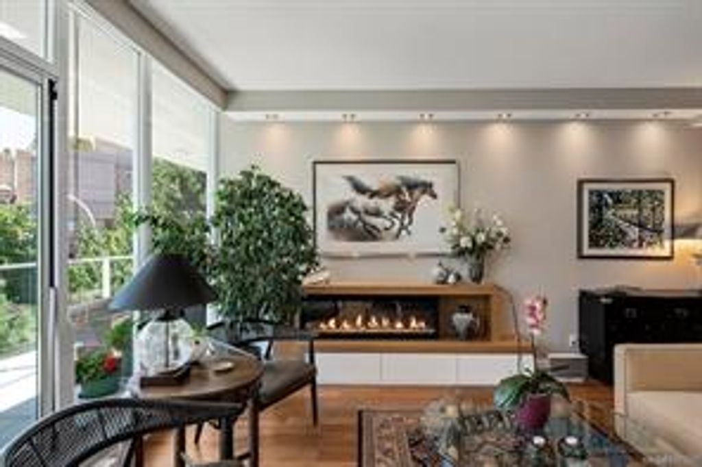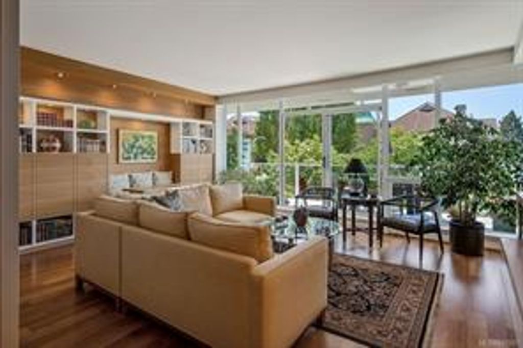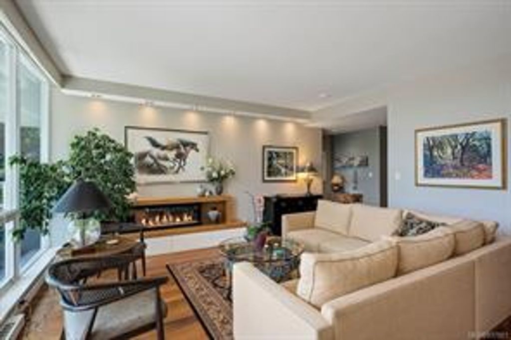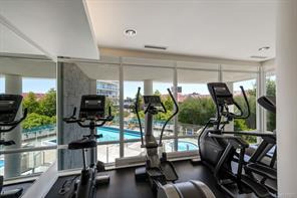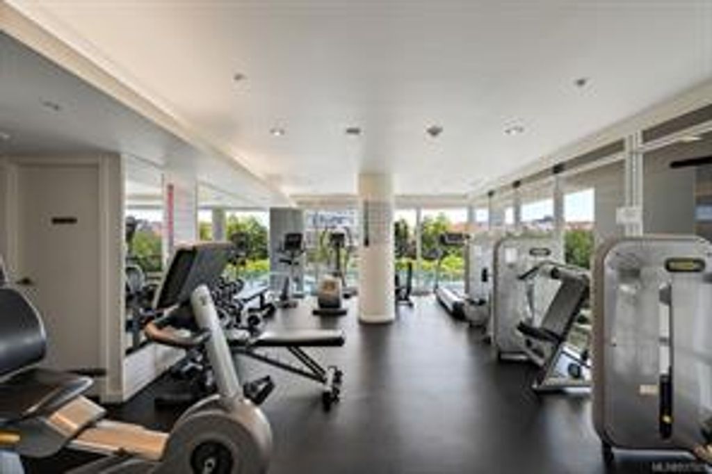 Discover Shutters Residences - a prestigious address in Victoria's Inner-Harbour. Premier 3-acre architecturally unique property enhanced by tranquil water gardens & resort-styled amenities: Heated outdoor lap pool, 2 hot tubs, steam room, sauna & fitness centre. This corner suite has 2 bedrooms, 2.5 baths, large living room & separate dining room can easily be repurposed as family area or den. Its main-floor location offers easy access to Kimta Rd. Its SW-facing balcony is perched high above Songhees Rd, ensuring privacy & views. The suite boasts wall to wall floor to ceiling windows, heated marble floor in Master ensuite, new custom kitchen offering upgraded high-quality appliances-panelled fridge/freezer & dishwasher, gas stovetop-electric convection oven, quartz countertops/backsplash, full width/height built-in custom wall-unit in living room with generous integrated wine-fridge & integrated banquette table/bench seating. Huge entertainment sized balcony with natural gas outlet.