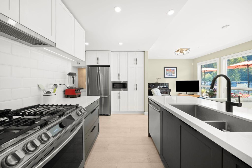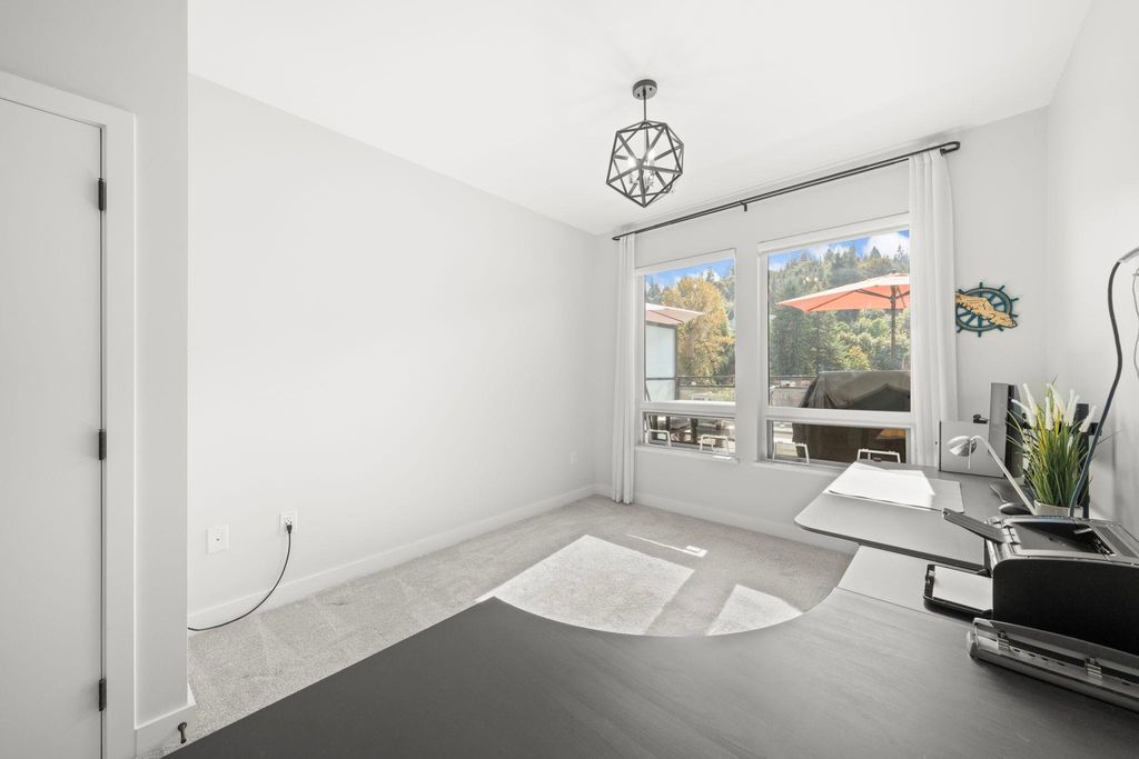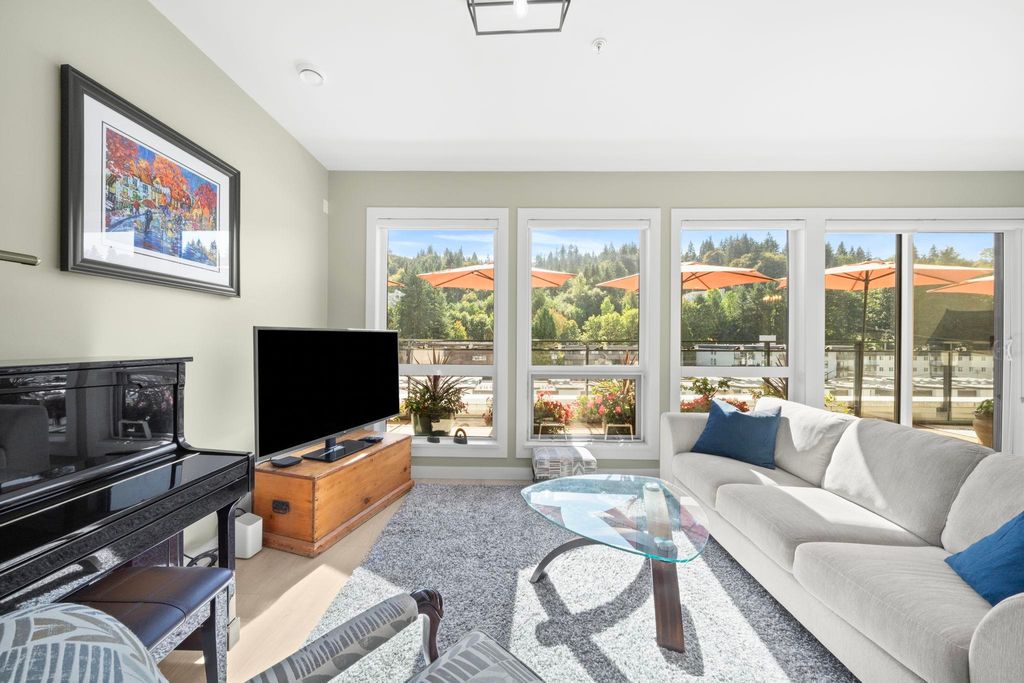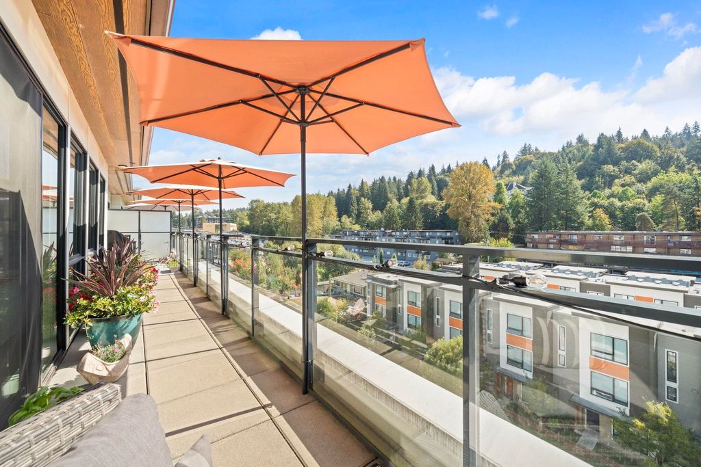 Experience the PENTHOUSE COLLECTION at George by Marcon. This rare south-facing 2-bed+den, 3-bath residence offers over 1,100 sq. ft. of sophisticated living space, perfect for those seeking a house-sized feel on one floor. The airy interior is flooded with natural light, overlooking a serene greenbelt and lush hillsides. Both bedrooms feature updated plush carpets and private ensuites with heated floors. Enjoy a versatile 100 sq. ft. den, guest powder room, and the comfort of A/C. This home is complete with window screens for days you want to enjoy the fresh air, 2 parking stalls and a large private storage room. Located just minutes from Moody Centre Station, Rocky Point Park, and the best of Port Moody’s vibrant lifestyle. A perfect blend of luxury and location!
