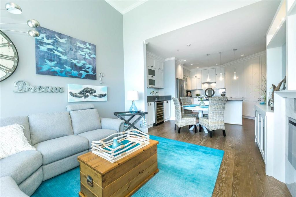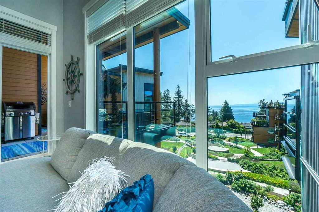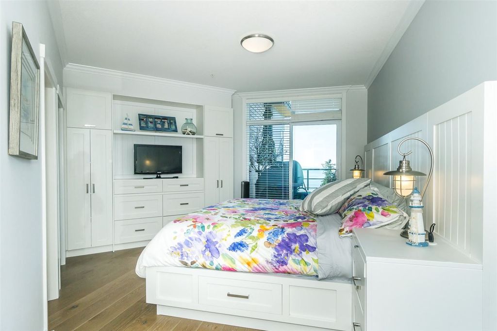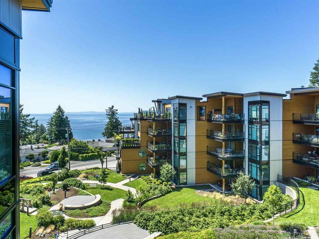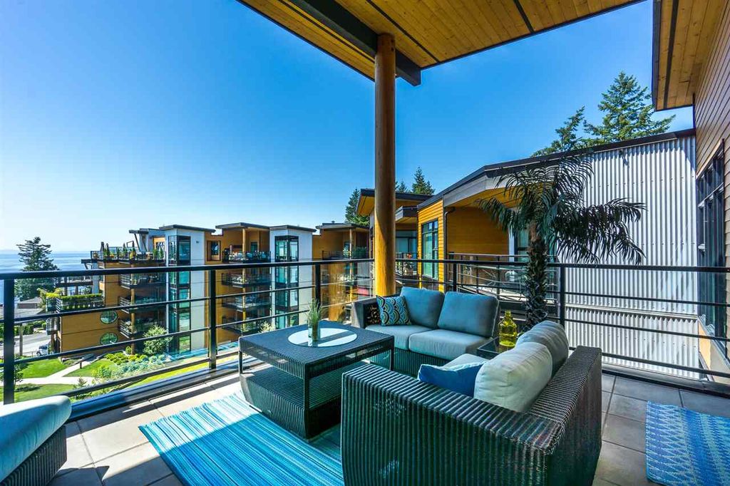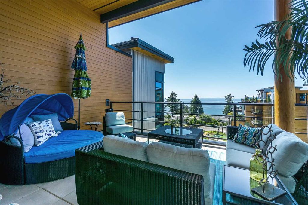 Stunning south facing, ocean view penthouse in the most desirable development in White Rock- The Royce! Winner of 2016 Georgie Award, designed by award winning Ankenman Architects, this rarely available pentouse offers 1171 sq ft of elegance and luxury. Breathtaking water views from living room, kitchen, bedrooms & large 300 sq ft covered patio. Upgrades include swedish oak hrdwd floors,Viking Appliances, crown moldings, floor to ceiling built ins, quartz countertops, marble backsplash,wet bar with wine fridge,crystal fireplace, soaring 9 ft & 13 ft ceilings and floor to ceiling windows. Pet & rental friendly complex with upscale gym and club room, 2 parking spots,storage + bike/golf locker.Walk to the beach & WR centre, live the lifestyle you've dreamed of ! OPEN HOUSE Sat Sep 15th 2-4pm