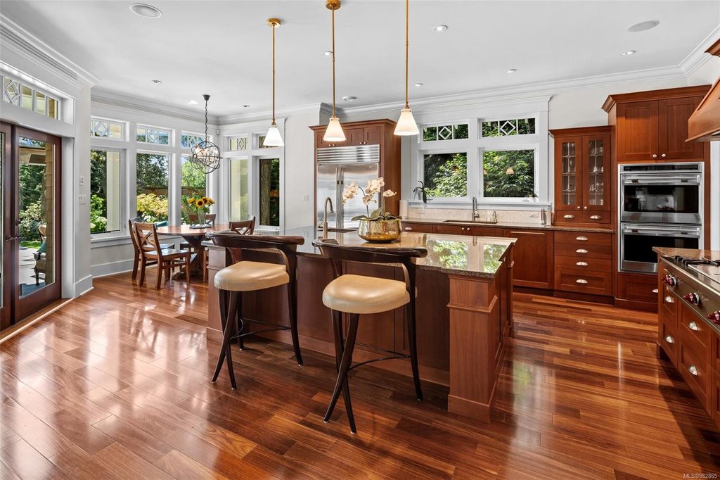 Welcome to this exquisite 4-bed, 5-bath Uplands family home, where luxury and comfort blend in a private, beautifully landscaped property. Step inside to discover a light-filled interior that perfectly balances elegance and functionality. The spacious living areas feature high ceilings, large windows, and premium finishes. The gourmet kitchen, with top-of-the-line appliances, is perfect for both everyday meals and grand entertaining. The primary suite is a sanctuary, with a spa-inspired en-suite bathroom, walk-in closet, and private access to the outdoors. Each of the additional bedrooms offers space and privacy, with well-appointed bathrooms. The backyard is a family delight, enjoy the resort-style pool and hot tub, patios with heaters and outdoor firepit with covered seating area. For those who appreciate the finer things in life, this home includes a fully equipped gym, wine cellar and media room. Detached garage offers parking for three vehicles and additional storage.