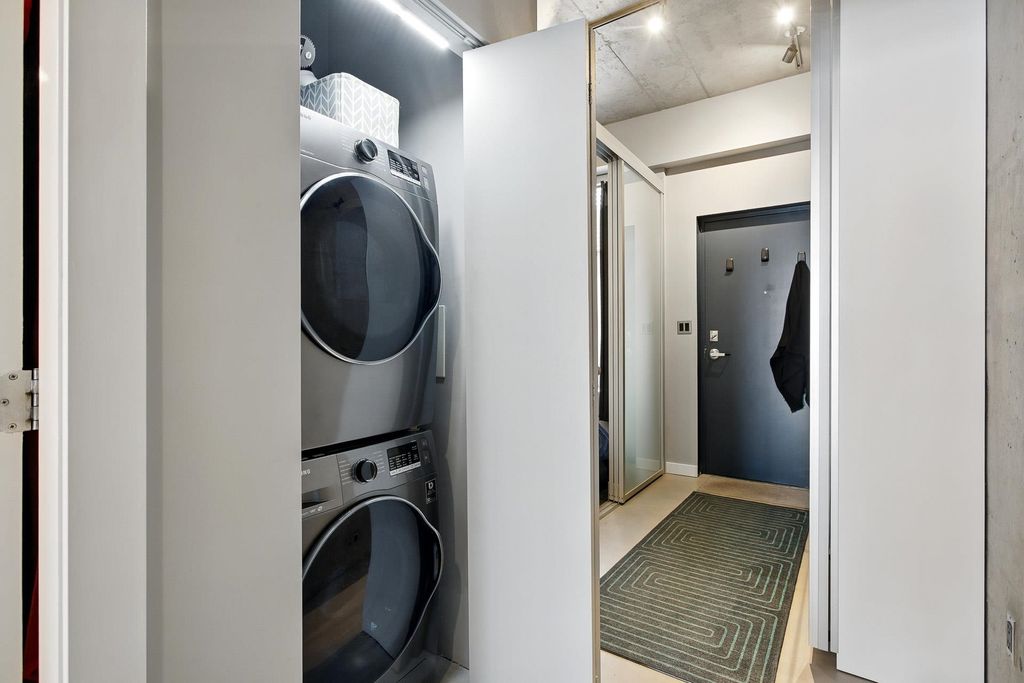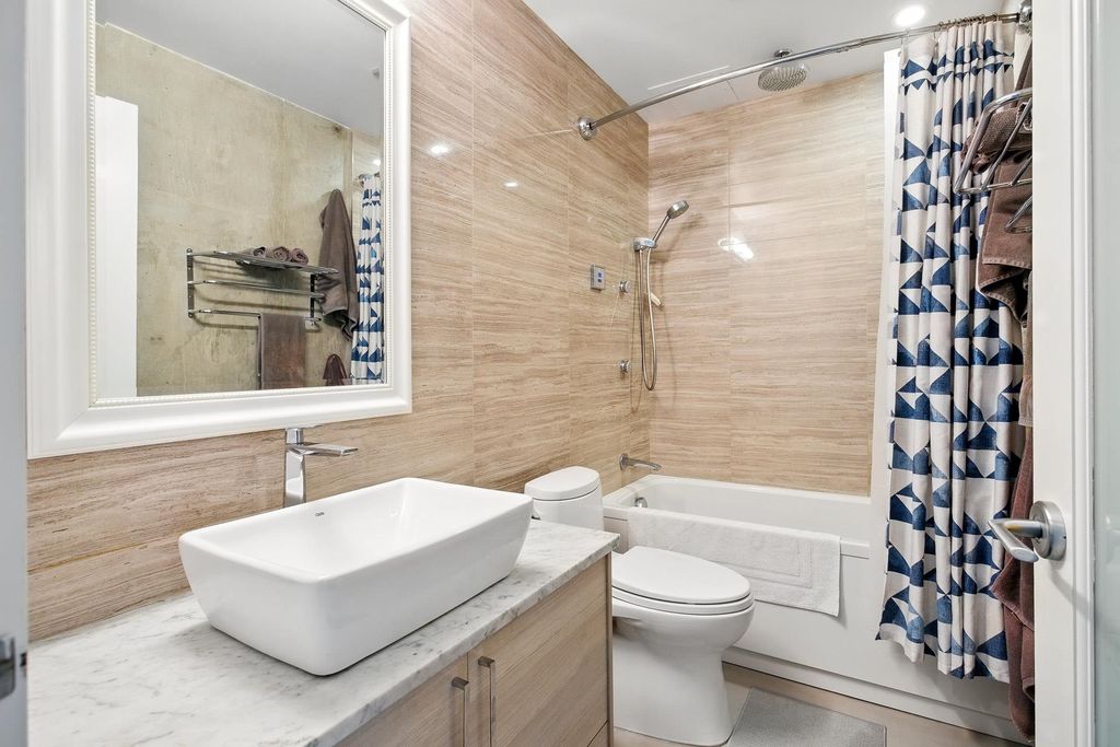 Enjoy Sleek & Modern Style w/10' concrete ceilings, custom flooring & upgraded lighting. Steps to False Creek Seawall, Olympic Village & trendy shopping districts, this stunning home offers unbeatable walkability, 50+ cafes, restaurants, parks &essentials like Whole Foods, Home Depot, & Save-On. Entertainers dream kitchen w/ quality appliance package including wine fridge & sleek custom cabinetry. Spacious living room features cozy gas fireplace (Incl in maint fee) & floor-to-ceiling windows w/ Hunter Douglas electric blinds. Relax in New Spa-inspired bathroom w/ electronic controls, rain shower air flow jet jacuzzi tub w/ heated backrest. Bedroom incl. a large closet & sliding glass doors. 100 Sq Ft patio facing the City & Mtn's! 1 Parking & shared locker. Walk to 3 SkyTrain lines too!