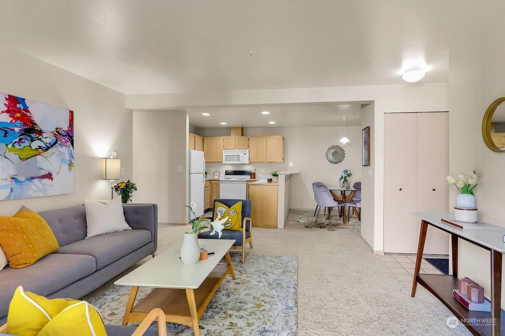 Explore this cozy condominium on the first floor within a secure gated community! This unit boasts 1 bedroom, 1 bath, and 682 sq ft of open-concept living, creating a spacious ambiance. Transition into this move-in-ready abode, freshly painted and ready for your personal touch. The dining area flows seamlessly into a cozy living space complete with a gas fireplace and a private patio, perfect for relaxing or entertaining. Enjoy the central location, with easy access to shopping, schools, dining, Boeing, I-5, and a golf course just a few blocks away. Benefit from two designated parking spaces.