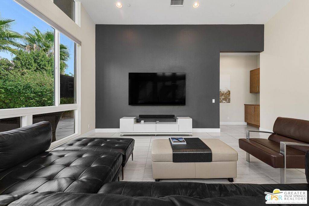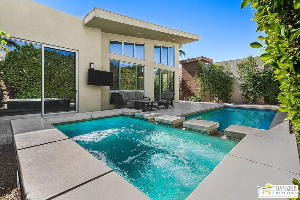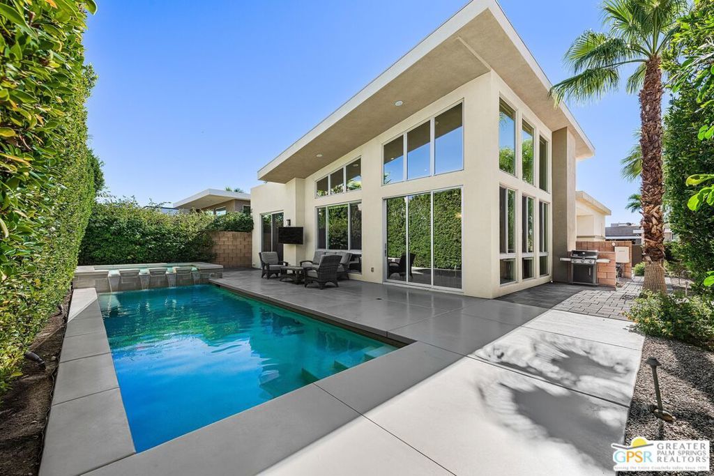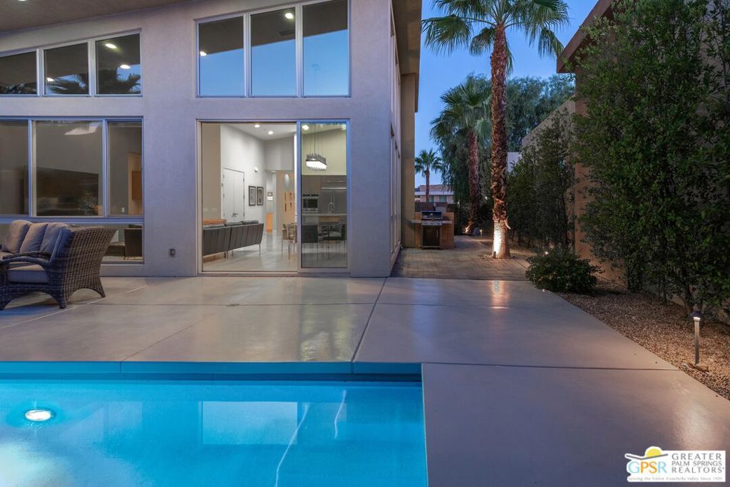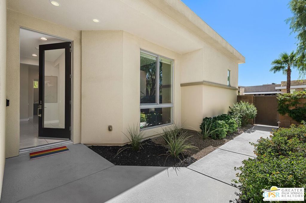 Set within the gated community of Escena, this Toll Brothers Brizo model blends architectural intent with everyday livability. Designed with mid-century influence and a modern sensibility, it features clean lines, ceilings rising to 16 feet, and walls of glass that bring light deep into the home. The open layout connects the kitchen, dining, and living areas in one effortless flow. Generous volume, natural light, and simple detailing create a sense of calm and clarity throughout. A true three-bedroom plan offers flexibility rare for the neighborhood, with the third bedroom suited for guests or a home office. Lush, established landscaping surrounds the home, where tall hedges frame a 30-foot saltwater pool and integrated spa with cascading water feature. Mountain glimpses, a mounted outdoor TV, and thoughtful outdoor design make the backyard ideal for quiet mornings or evening entertaining. The primary suite opens directly to the pool and spa, while a private entry courtyard frames striking western mountain views. Residents of Escena enjoy a gated environment of desert-modern architecture with low HOA fees, a newly remodeled clubhouse and grill, walkable streets, a community "Bark Park," and access to some of Palm Springs' most admired mountain and golf course views.