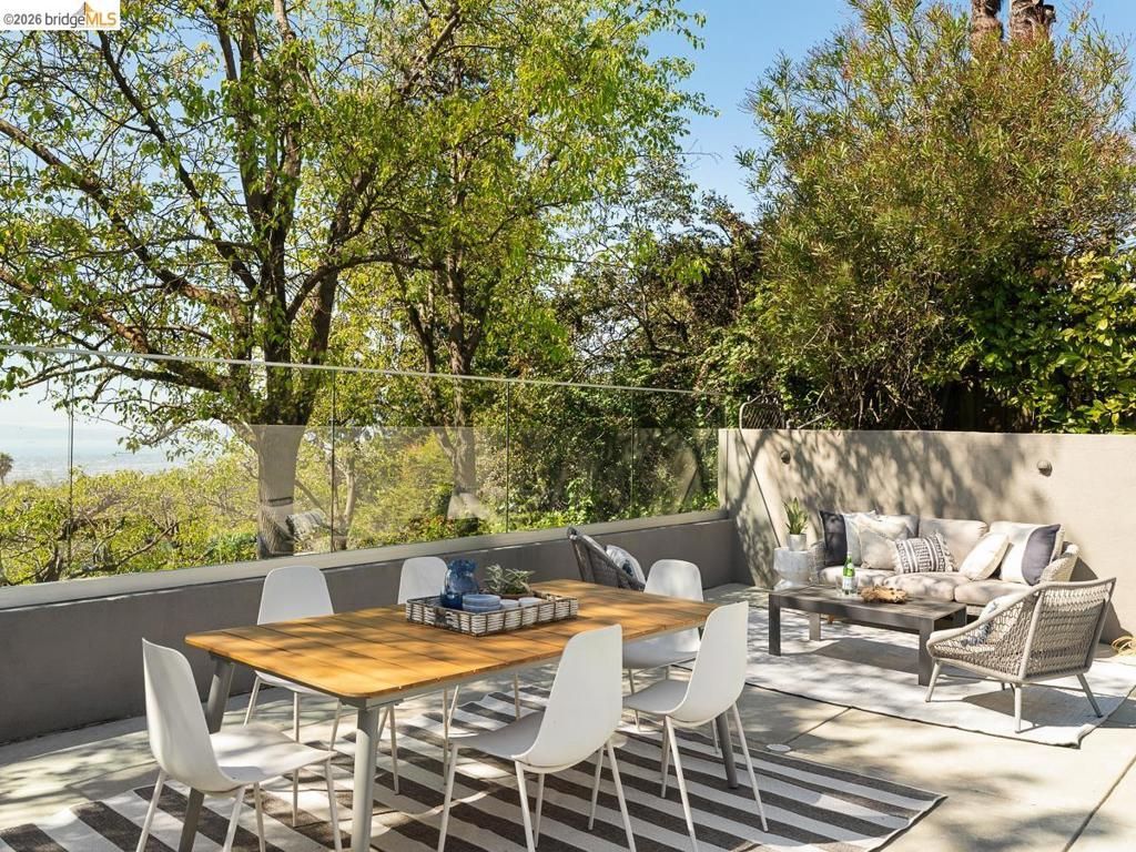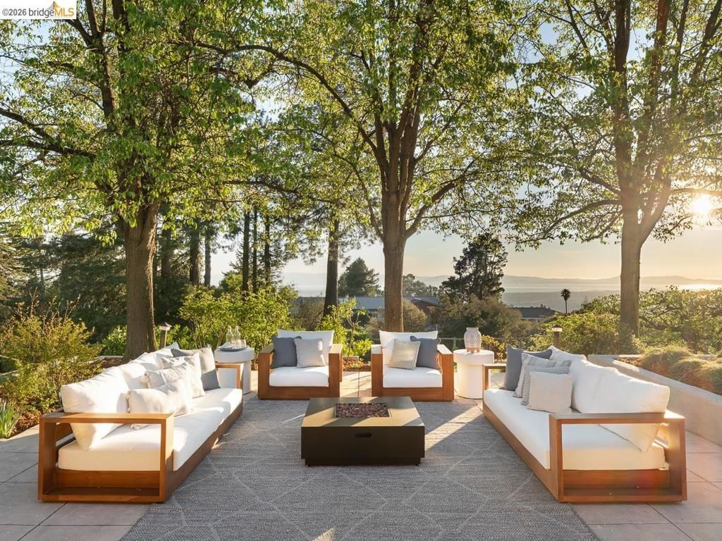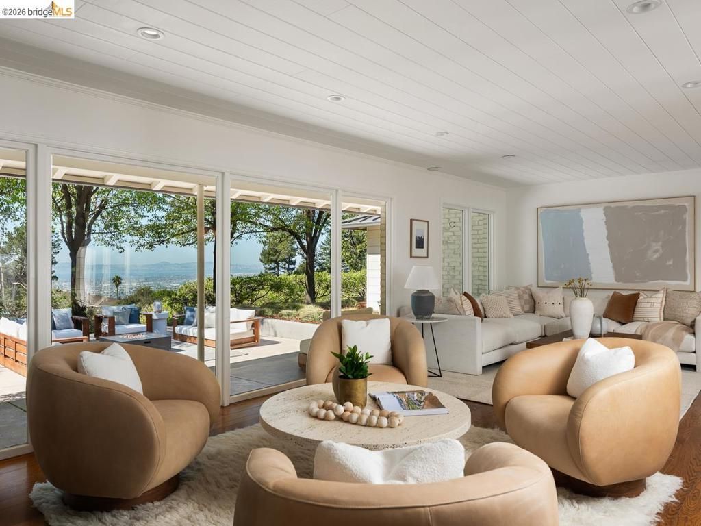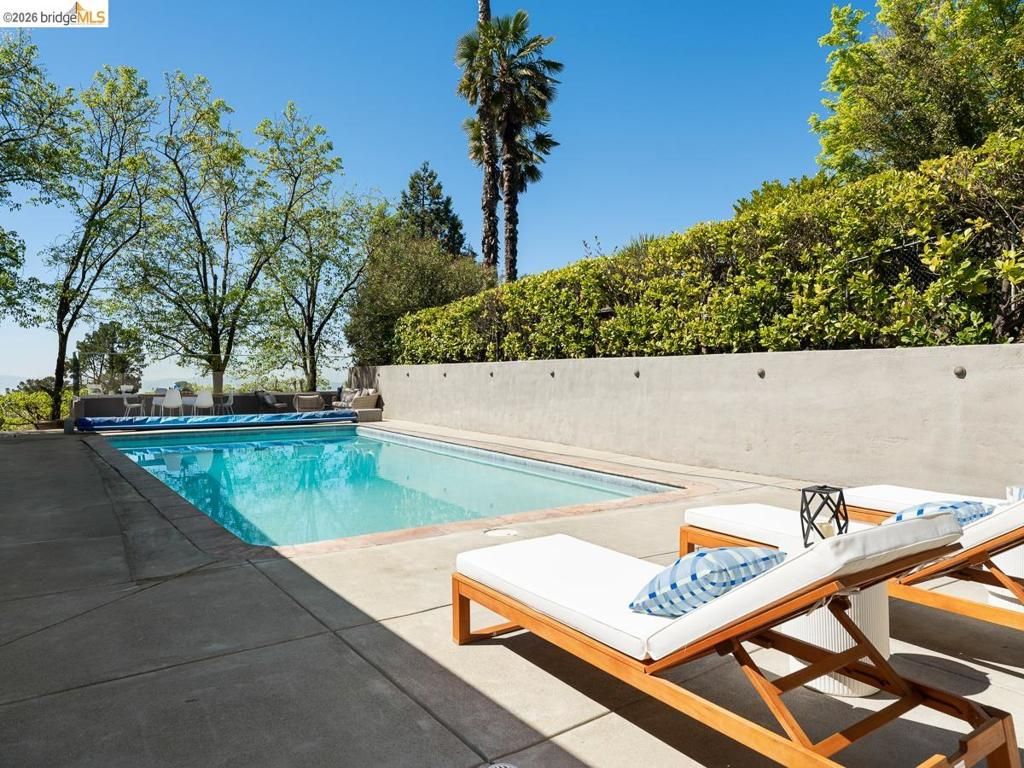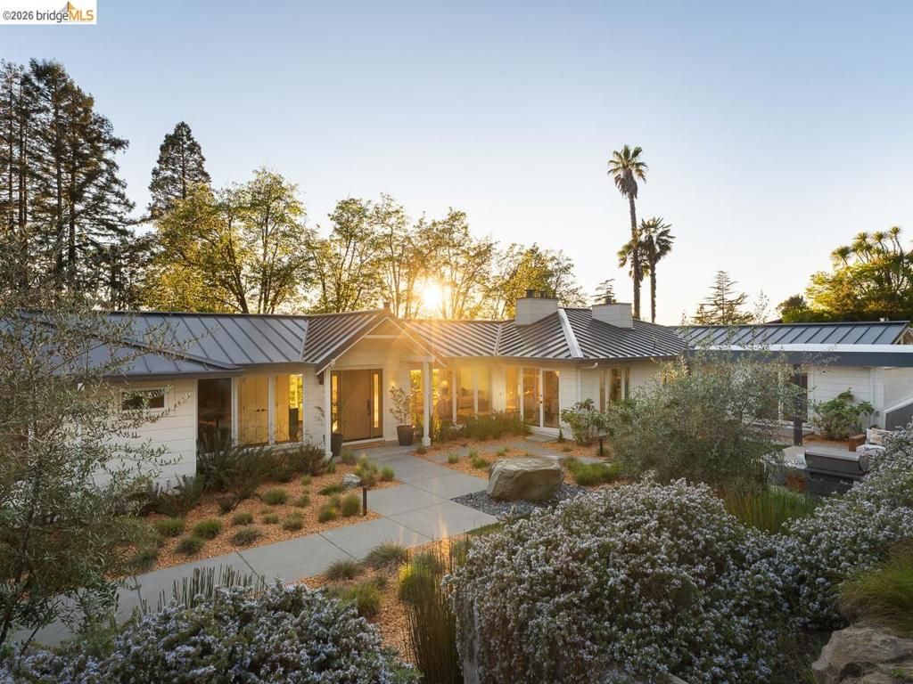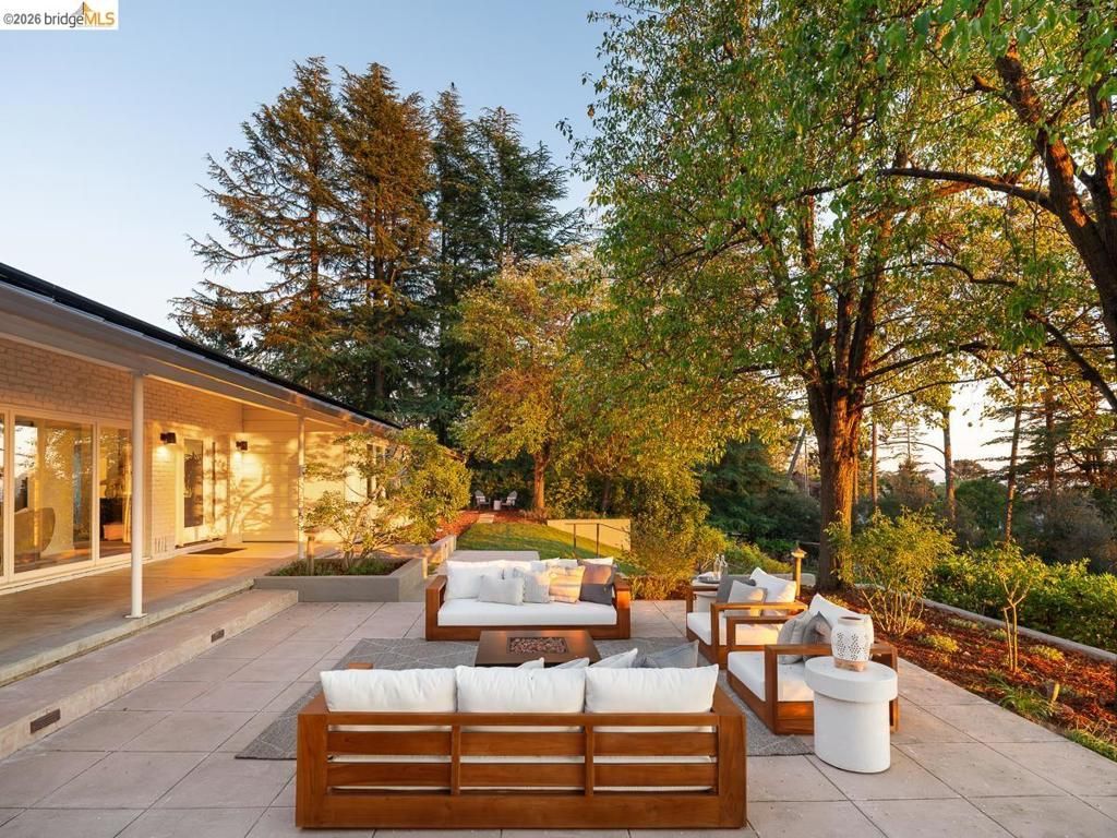 Set on approximately 1.1 acres in the coveted Hillcrest Estates enclave of the Oakland Hills, Skyland offers a rare blend of space, privacy, and natural beauty. Originally built in 1948 and thoughtfully reimagined in 2021, this single-level home balances timeless architecture with modern living. Walls of glass fill the home with natural light while framing views of redwoods, curated grounds, and the Bay. The well-designed layout includes 4 bedrooms, 4.5 baths, highlighted by a luxurious primary suite with a spa-like bath, steam shower, and soaking tub, along with a private guest suite. A dedicated executive office and separate studio/gym support work, creativity, and wellness. Designed for both everyday living and entertaining featuring a heated pool with Bay views, a pergola lounge with integrated lighting and sound, expansive patios, and a rare level lawn surrounded by mature landscaping originally envisioned by Napa Valley designer Jack Chandler. The kitchen offers marble countertops, Wolf and Sub-Zero appliances, abundant storage, and a walk-through pantry. Solar, a whole-home generator, enterprise-grade networking, and advanced air filtration complete the home; single-level living on over an acre with Bay views, an incredibly rare combination seldom found in the Bay Area.