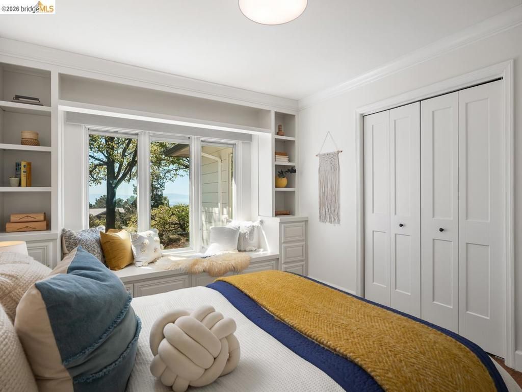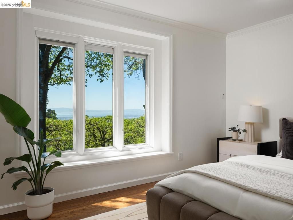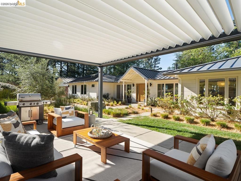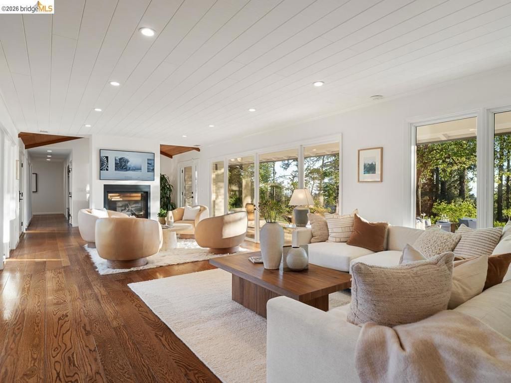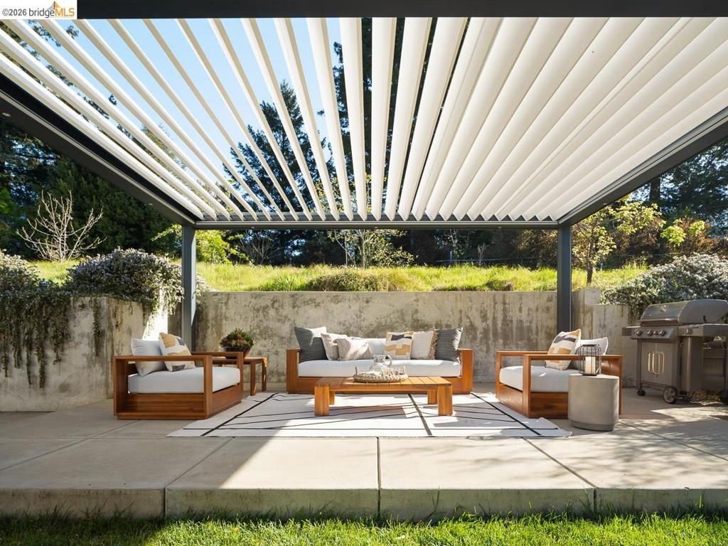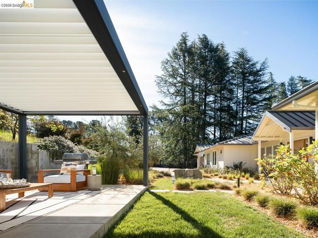Set on approximately 1.1 acres in the coveted Hillcrest Estates enclave of the Oakland Hills, Skyland offers a rare blend of space, privacy, and natural beauty. Originally built in 1948 and thoughtfully reimagined in 2021, this single-level home balances timeless architecture with modern living. Walls of glass fill the home with natural light while framing views of redwoods, curated grounds, and the Bay. The well-designed layout includes 4 bedrooms, 4.5 baths, highlighted by a luxurious primary suite with a spa-like bath, steam shower, and soaking tub, along with a private guest suite. A dedicated executive office and separate studio/gym support work, creativity, and wellness. Designed for both everyday living and entertaining featuring a heated pool with Bay views, a pergola lounge with integrated lighting and sound, expansive patios, and a rare level lawn surrounded by mature landscaping originally envisioned by Napa Valley designer Jack Chandler. The kitchen offers marble countertops, Wolf and Sub-Zero appliances, abundant storage, and a walk-through pantry. Solar, a whole-home generator, enterprise-grade networking, and advanced air filtration complete the home; single-level living on over an acre with Bay views, an incredibly rare combination seldom found in the Bay Area.