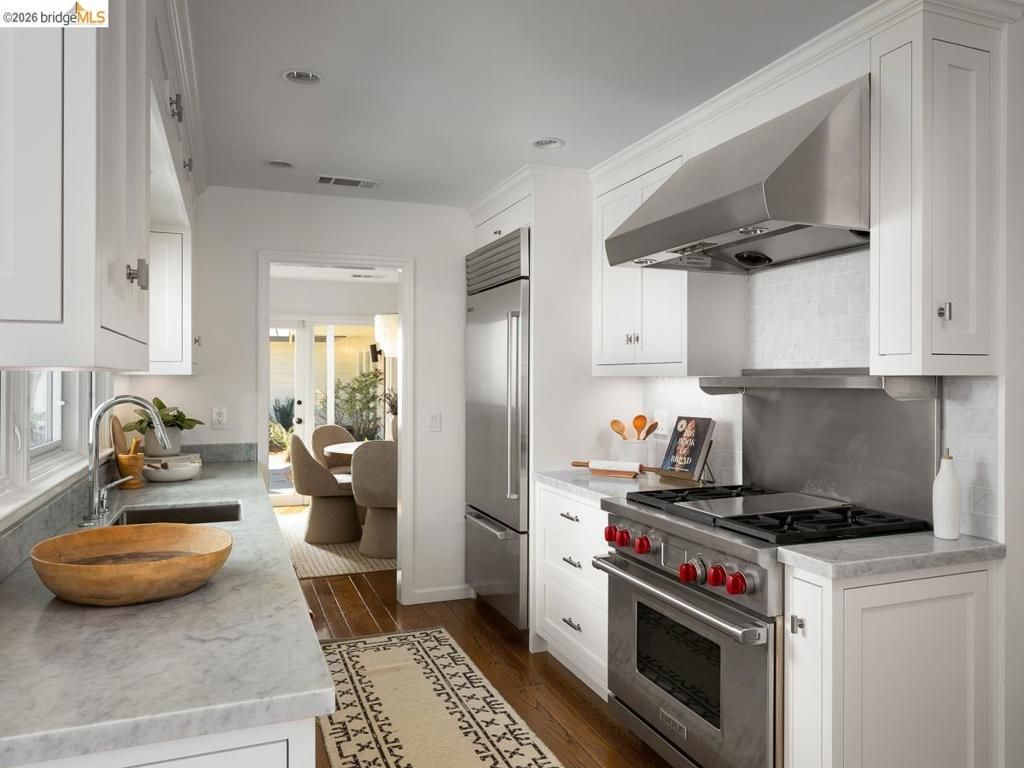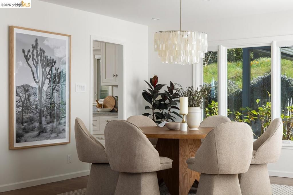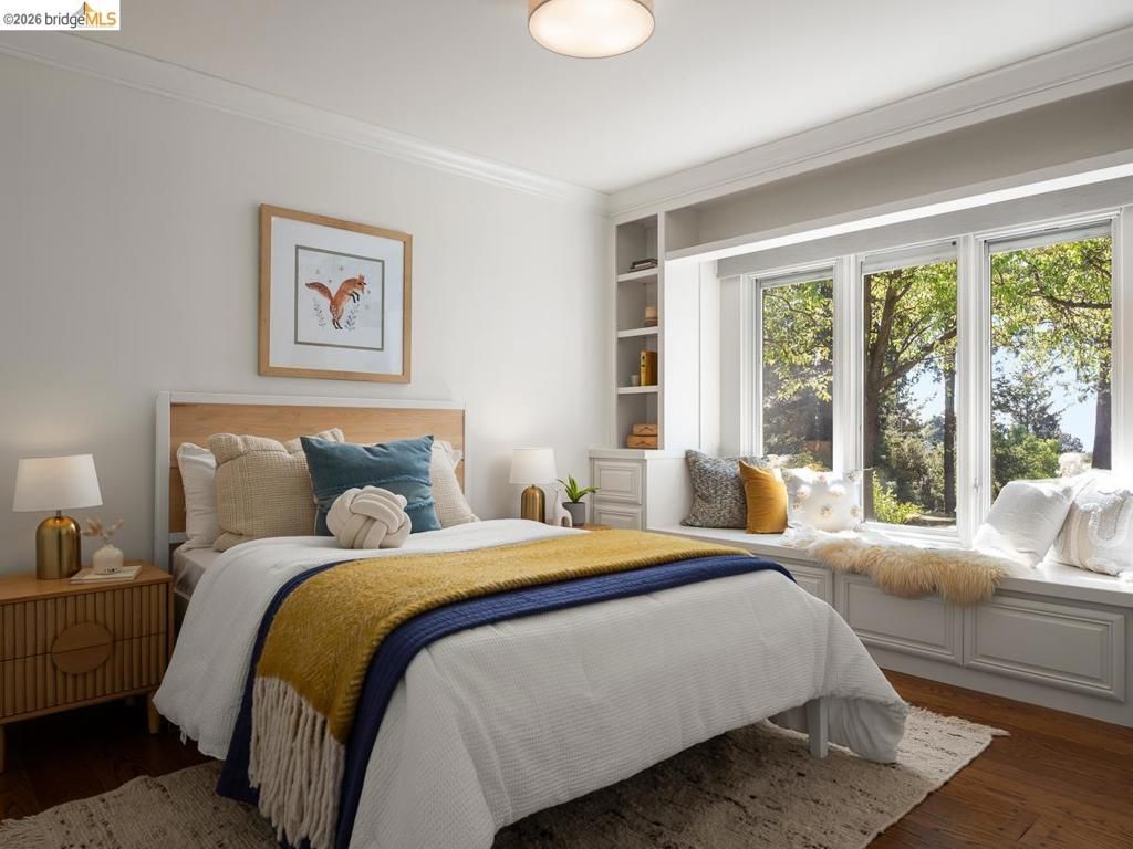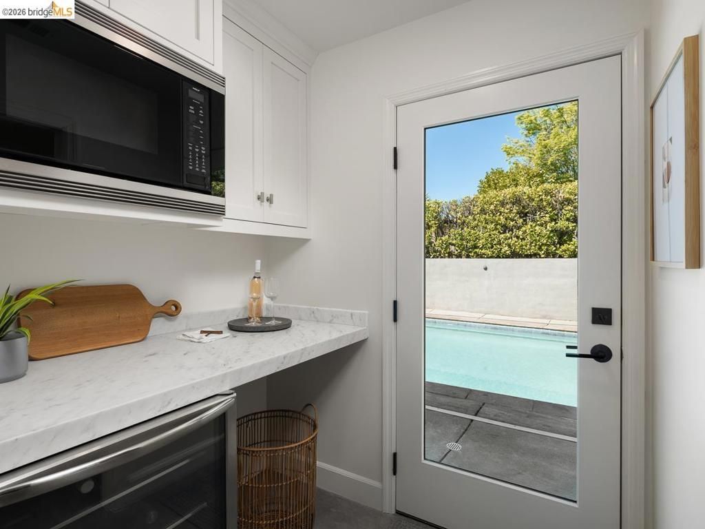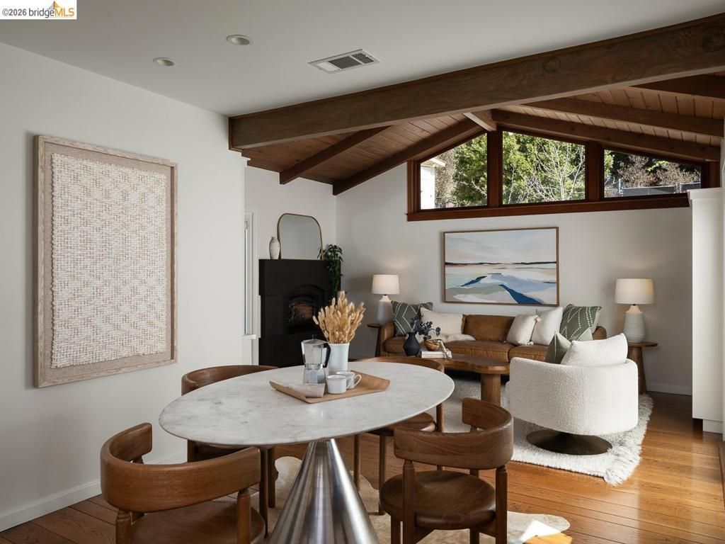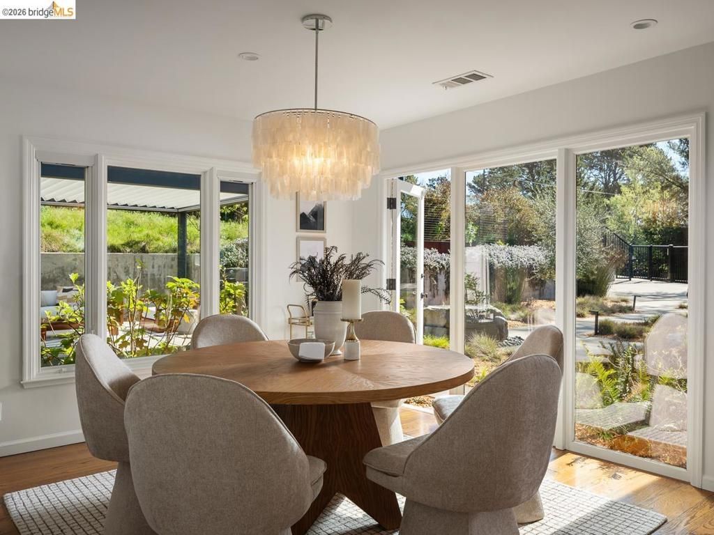 Set on approximately 1.1 acres in the coveted Hillcrest Estates enclave of the Oakland Hills, Skyland offers a rare blend of space, privacy, and natural beauty. Originally built in 1948 and thoughtfully reimagined in 2021, this single-level home balances timeless architecture with modern living. Walls of glass fill the home with natural light while framing views of redwoods, curated grounds, and the Bay. The well-designed layout includes 4 bedrooms, 4.5 baths, highlighted by a luxurious primary suite with a spa-like bath, steam shower, and soaking tub, along with a private guest suite. A dedicated executive office and separate studio/gym support work, creativity, and wellness. Designed for both everyday living and entertaining featuring a heated pool with Bay views, a pergola lounge with integrated lighting and sound, expansive patios, and a rare level lawn surrounded by mature landscaping originally envisioned by Napa Valley designer Jack Chandler. The kitchen offers marble countertops, Wolf and Sub-Zero appliances, abundant storage, and a walk-through pantry. Solar, a whole-home generator, enterprise-grade networking, and advanced air filtration complete the home; single-level living on over an acre with Bay views, an incredibly rare combination seldom found in the Bay Area.